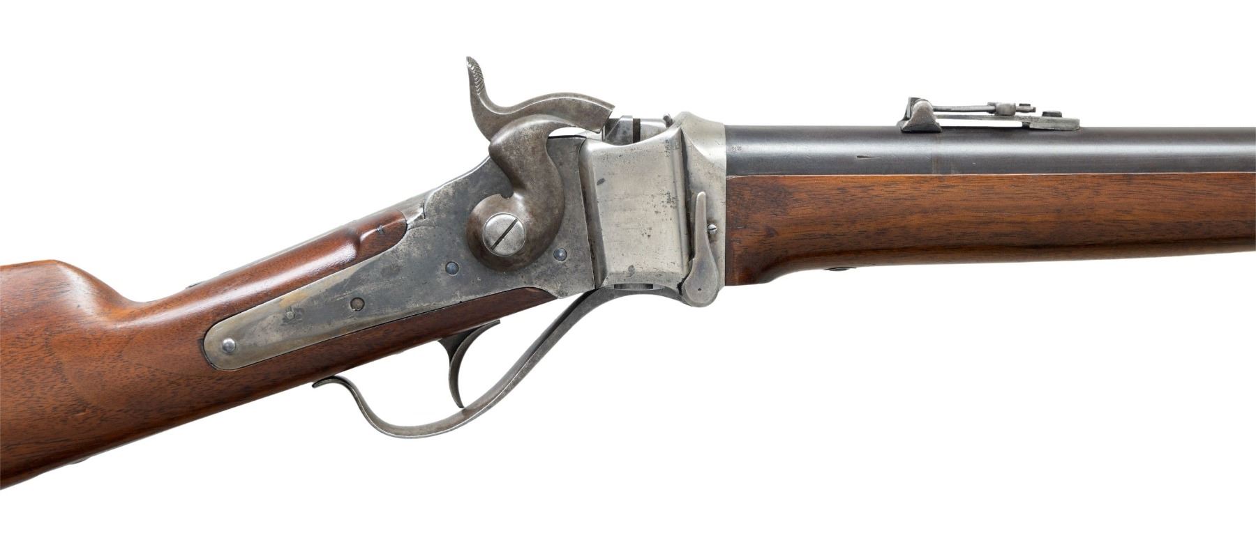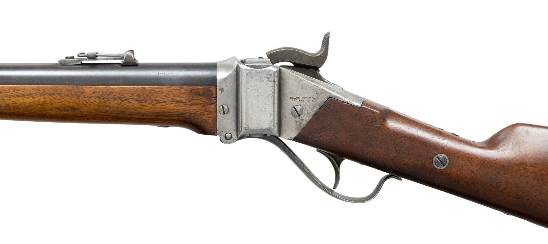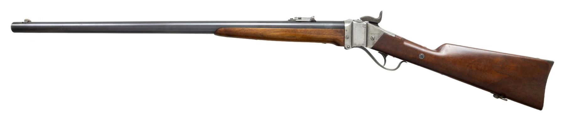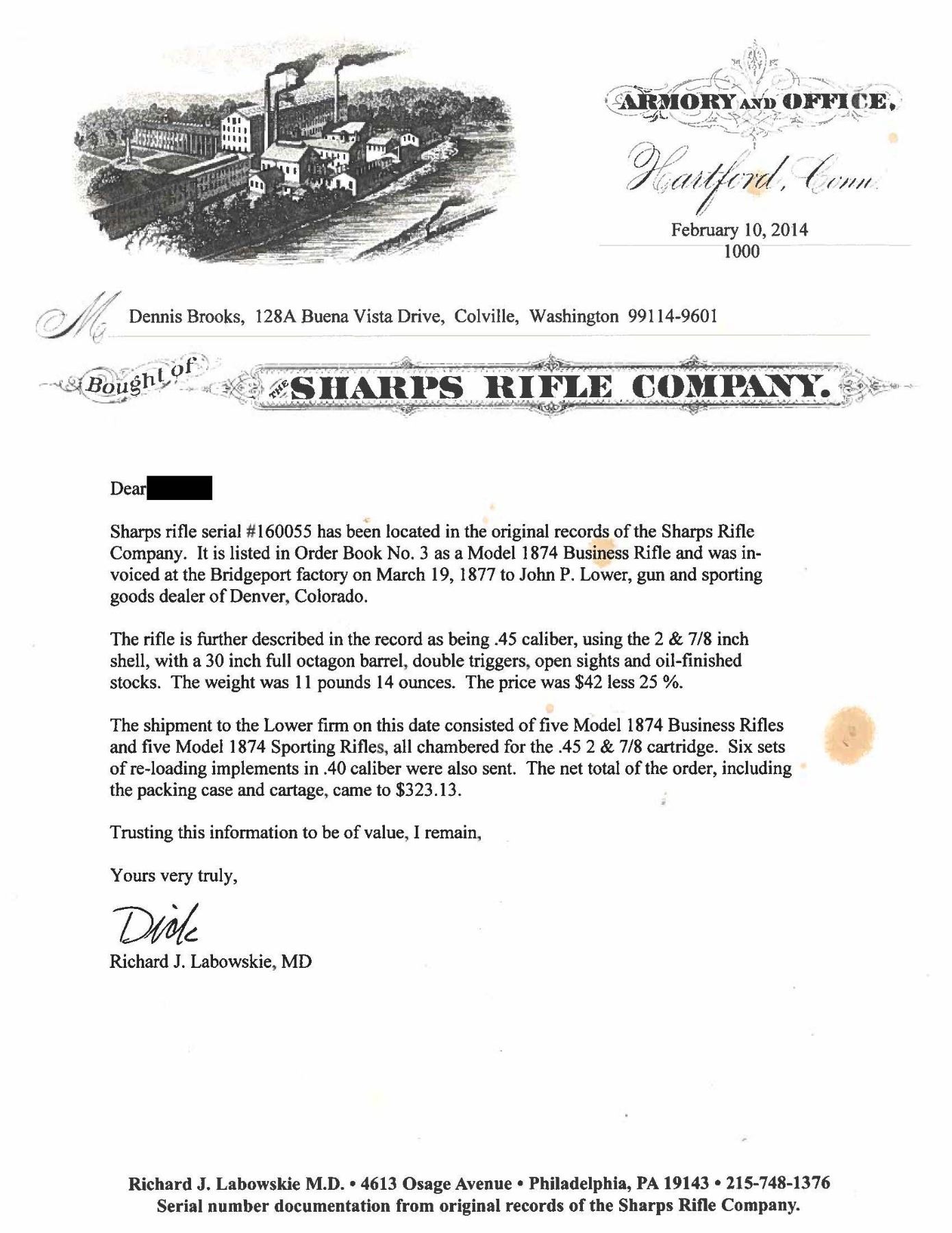 Cal. 45, 2 7/8" Sharps Straight. S# 160055. Bbl. 28" rnd. with Bridgeport address. Top of bbl. ahead of breech is marked "CAL 45". Left side of bbl. is marked "BUSINESS 45". German silver blade front sight with Lawrence patent rear sight. Top tang has plug screws in 2 holes for tang sight attachment. Blue finished bbl. with case colored action. Plain trigger. Walnut forearm and straight grip stock with steel rifle buttplate and rear sling swivel. Weight: 10lbs. 5.8oz. UNATTACHED ACCESSORIES: includes a Sharps Rifle Company letter with contradictory information, stating "Sharps rifle serial #160055 has been located in the original records of the Sharps Rifle Company. It is listed in Order Book No. 3 as a Model 1874 Business Rifle and was invoiced at the Bridgeport factory on March 19, 1877 to John P. Lower, gun and sporting goods dealer of Denver, Colorado. The rifle is further described in the record as being .45 caliber, using the 2 & 7/8 inch shell, with a 30 inch full octagon barrel, double triggers, open sights, and oil-finished stocks. The weight was 11 pounds 14 ounces. The price was $42 less 25%.". CONDITION: bbl. retains 80% lightly faded blue showing spots of light pitting and handling marks with a single wrench mark on the right side of the bbl. behind the front sight. Action has gray/brown appearance showing dents and marks with file marks at top of action showing evidence of aggressive cleaning. Left side of action at and above the lever pin shows small cracks. Heavily sanded and refinished wood shows scattered marks. Lightly pitted bore retains sound rifling. (01-27582/DS). ANTIQUE. $3,500-5,000.
