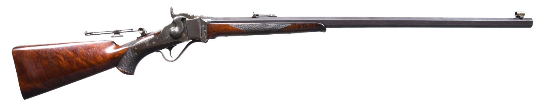 SHARPS EMPLOYEE GEORGE F. HULL. Cal. 45. 2 1/10" (45-70). S# 161308. Bbl. 30" octagon measuring 7/8" across flats at muzzle. Top flat is marked "Old Reliable" w/ "SHARPS RIFLE CO. BRIDGEPORT, CONN." address. Bottom bbl. flat is numbered to the action w/ additional marking "5 10/16". Globe front sight w/ Lawrence patent rear sight & long range Vernier tang sight w/ metal cup eyepiece. Vernier sight is tang mounted on an unnumbered base. This rifle fits the general criteria of a no. 3 mid-range target rifle. Case colored action features a checkered single trigger. Schnable tipped walnut forearm w/ wraparound point pattern hand checkering having an additional triangle of checkering near the tip. Pistol grip stock of fancy walnut w/ checkered steel shotgun butt. Wrist has point pattern hand checkering w/ additional diamonds along both sides of top tang & oval of checkering on bottom of pistol grip. Comb of stock has metal base for Vernier sight attachment. Left side of stock has a German silver oval presentation plate. WEIGHT: 10 lbs, 2.8 oz. UNATTACHED ACCESSORIES: R.L. Moor MD letter dated April 18, 1986 details "Your Sharp's Rifle Serial Number 161308 has been located in the Original Sharp's Rifle Company Records of the Old Reliable, Bridgeport, Connecticut, plant. / This gun was invoiced June 16, 1877, to George F. Hull. It is noted as a Model 1874 Sporting Octagon Rifle. The calibre was .45 and it had a full 30 inch octagonal barrel. The weight was 9 lbs. 14 oz. and the list price was $38 with a 20% discount. / George F. Hull was an employee of the Sharp's Rifle Company and apparently had access to fancy wood and target sights. Many of his guns that were charged to him apparently were altered, probably by himself to his wishes. / Congratulations on owning one of Hull's guns and I am sure you will notice his expert touch." CONDITION: bbl. retains 80% dull blue fading to brown showing scattered spots of freckling & handling marks. Action retains some lightly visible case colors in protected areas w/ balance having a faded brown appearance. Wood has lightly worn checkering & gloss finish showing scattered scratches & small marks. Stock is cracked between the top tang & lockplate. Sound mechanics. Bright bore retains sound rifling. PROVENANCE: Lifelong collection of Richard A. Baumann. (01-26015/DS). ANTIQUE. $8,000-18,000.