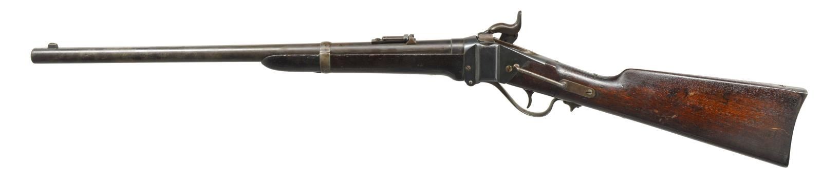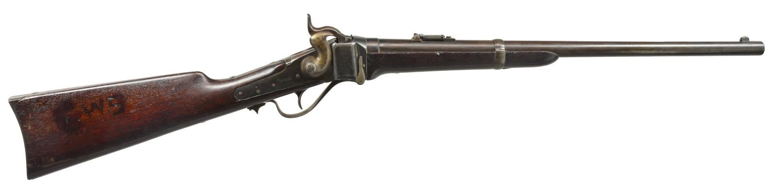Cal. 20 Ga. S# 79304. Bbl. 22" w/ blade front sight & Lawrence patent adj. leaf rear sight. Centerfire conversion action. Primer feed mechanism removed from sideplate. Left side has saddle ring bar, ring is removed. Band fastened walnut forearm & straight grip stock w/ steel carbine buttplate. Right side of stock has hand carved initials "F.W.S". Left side of stock has initials "ES". CONDITION: bbl. blue is fading to a smooth brown patina. Reblued action retains 40% dull faded blue. Refinished wood shows scratches & marks w/ sm. chip below lock plate. Bore shows scattered pitting. (01-18220/DS). ANTIQUE. $1,250-1,750.