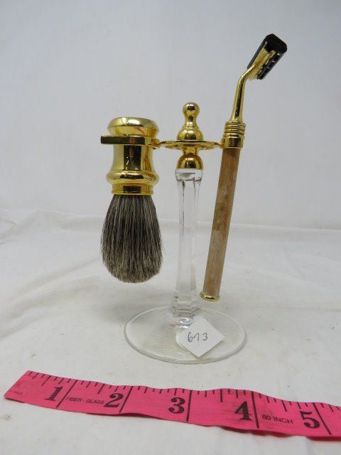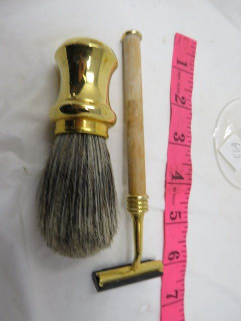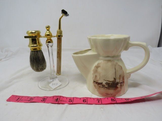 SHAVING ITEMS, PORCELAIN CUP, BRUSH & RAZOR ON STAND