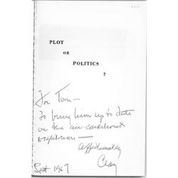 (d. 1974) New Orleans businessman and alleged acquaintance of Lee Harvey Oswald from Oswald's involvement in Fair Play for Cuba. District Attorney Jim Garrison charged Clay with conspiracy in Kennedy's assassination, proving Clay was a CIA operative, but ultimately lost the case after ruining Clay financially. Exceptionally rare and fine association signed book Plot or Politics? The Garrison Case & Its Cast, by Rosemary James & Jack Wardlaw, Pelican Publishing, New Orleans, 1967, a probable first edition. Inscribed by Shaw on the half-title page: "For Tom - To bring him up to date on the air-conditioned nightmare - Affectionately Clay Sept. 1967". The book, written by two journalists, offers a fairly unbiased background and account of the ongoing trial, and has a valuable biographical appendix of the trial's principal players. Very good.