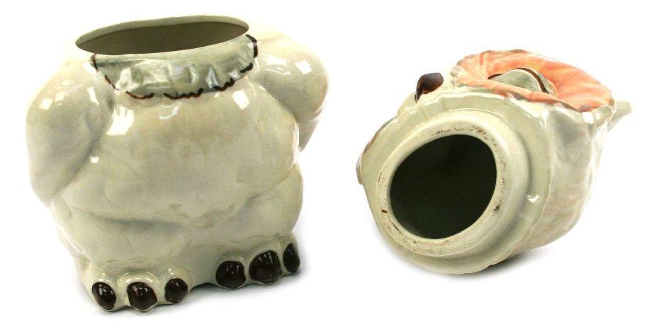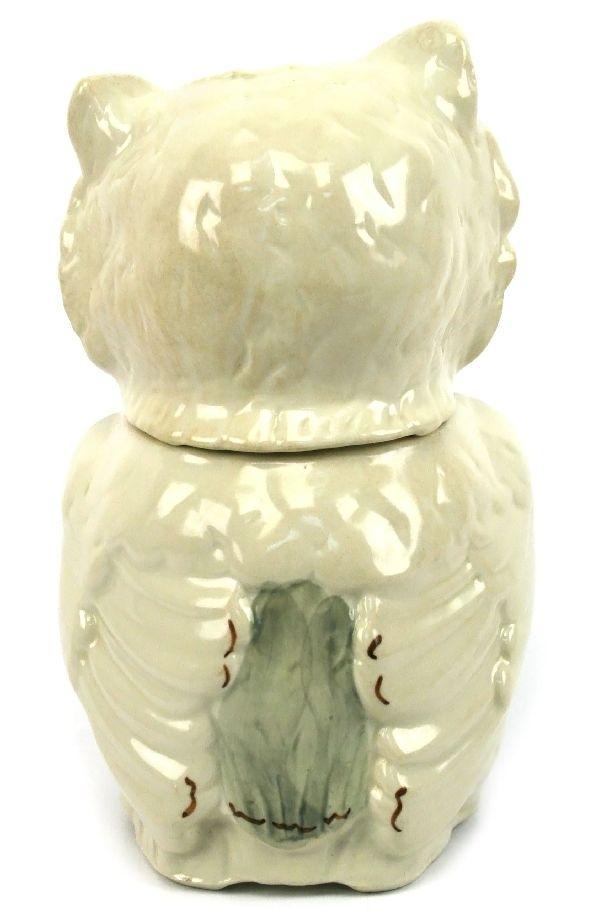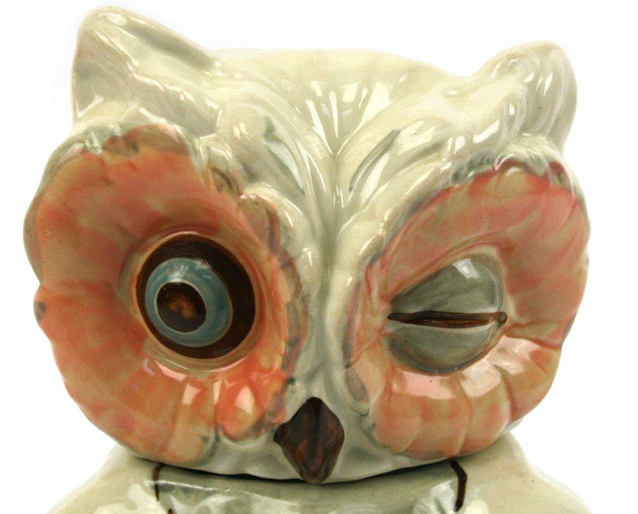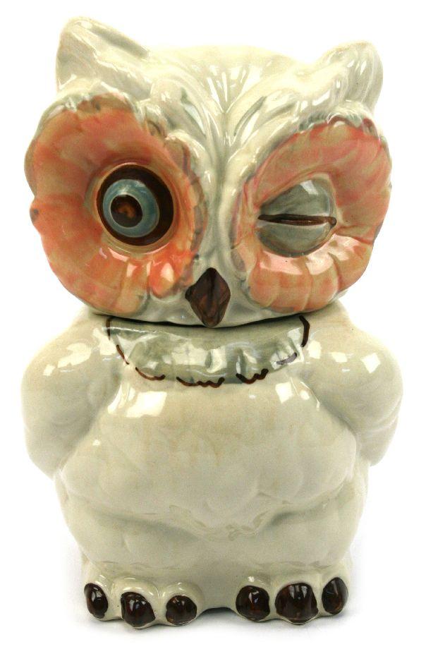 11.5 inches in height. Ceramic winking owl cookie jar by Shawnee (Zainesville, OH, 1937-1961). Very good condition with no chips, cracks, or crazing.