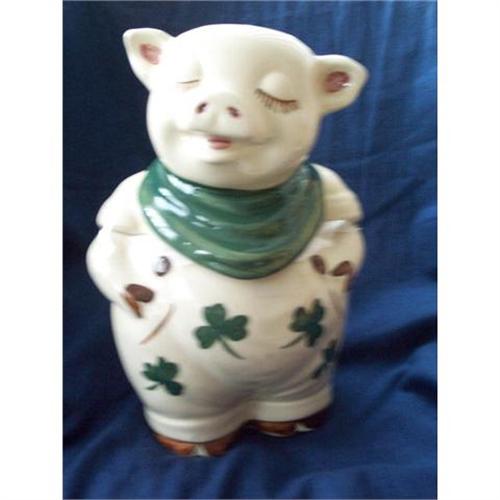 This is an outstanding Shawnee Simley Face Pig Cookie Jar. He has pink color ears and mouth and is decorated with shamrocks. Also he has a green scarf around his neck.