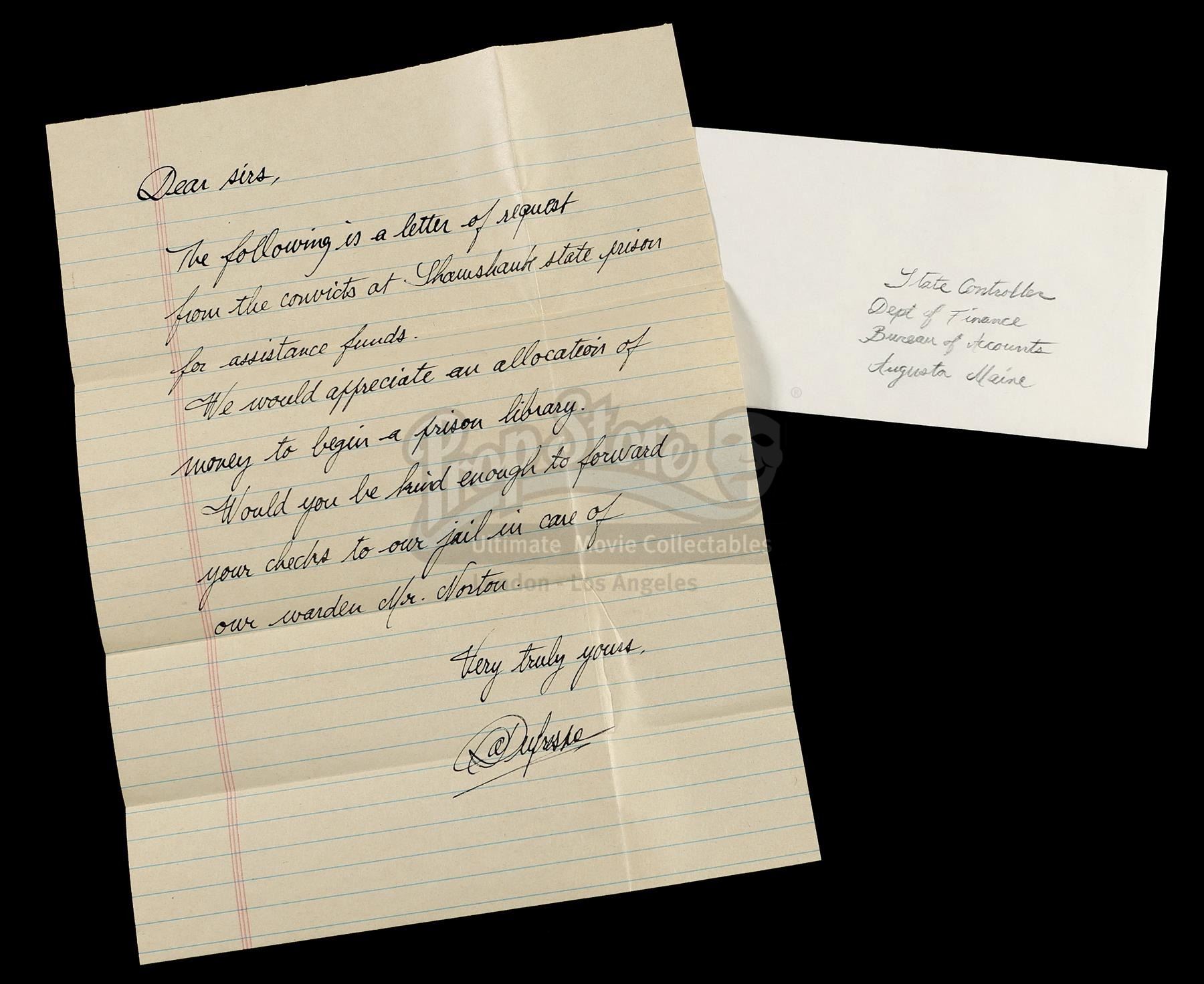 Andy's (Tim Robbins) handwritten funding request letter from Frank Darabont's prison drama The Shawshank Redemption. Sentenced to life in Shawshank State Penitentiary, Andy Dufresne (Robbins) developed a bond with a fellow inmate (Morgan Freeman) and laundered money for the corrupt warden (Bob Gunton). During this time, Andy began writing weekly letters to the State's Department of Finance asking for funds to improve the prison's library.