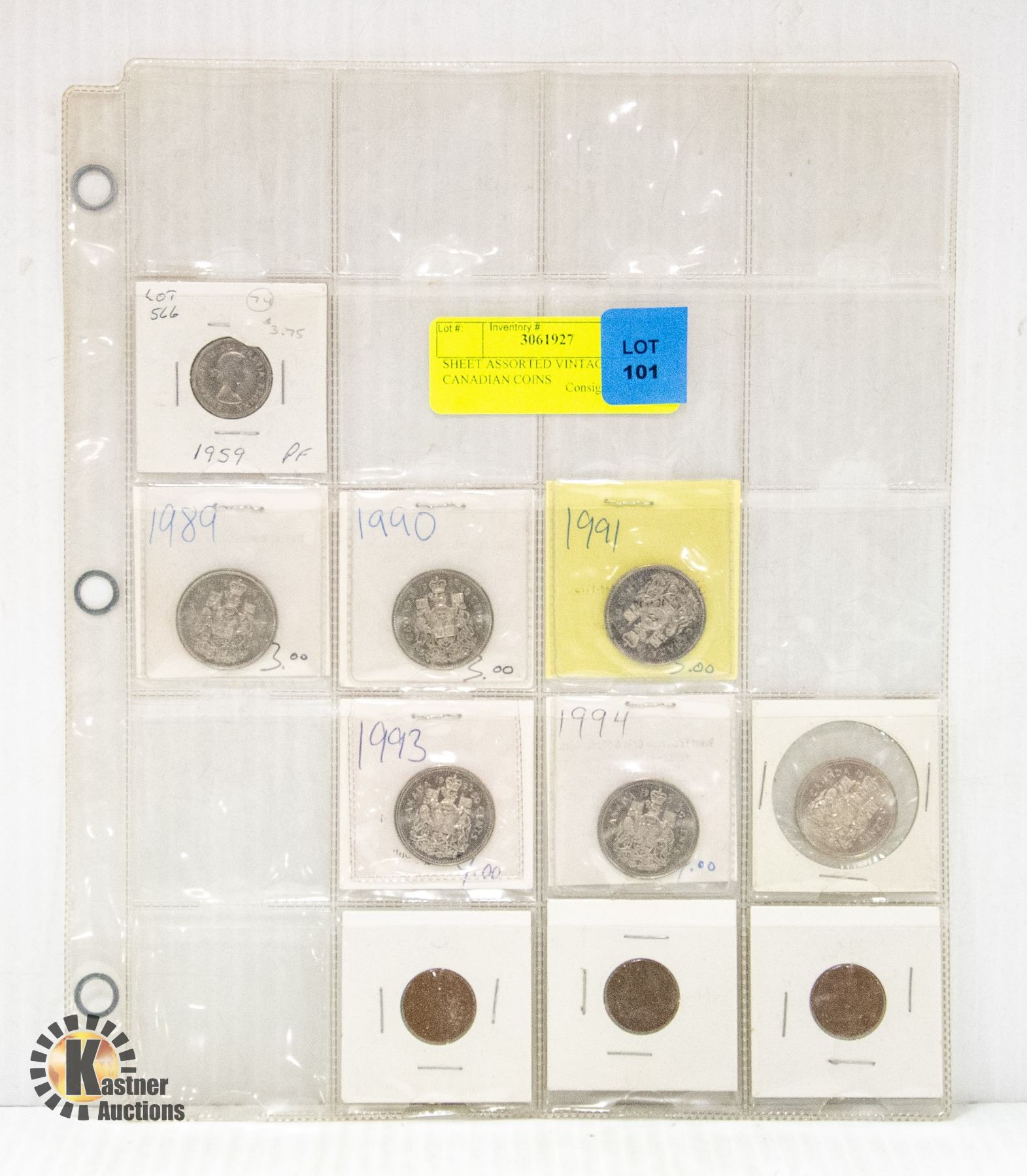 SHEET ASSORTED VINTAGE CANADIAN COINS