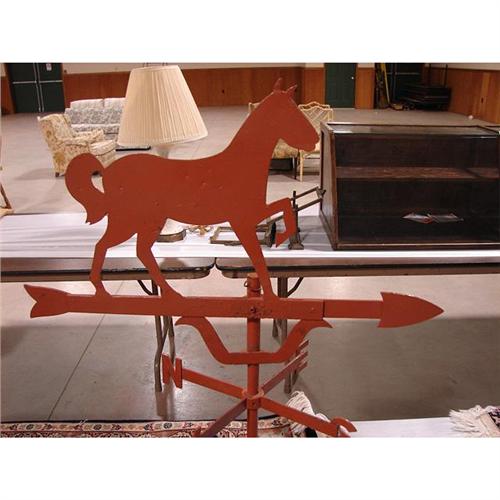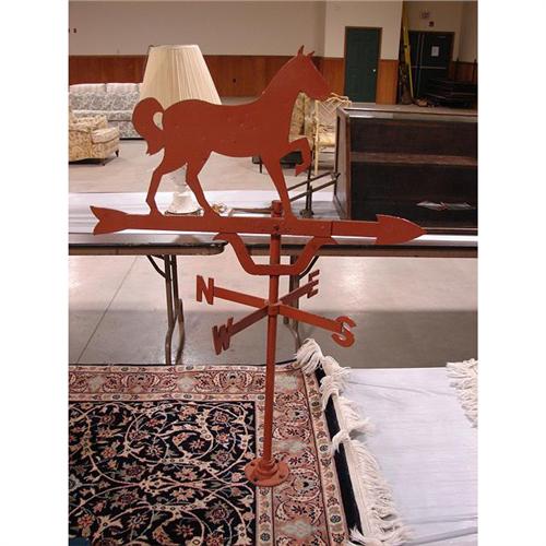 SHEET METAL HORSE WEATHERVANE. First half 20th century. Depicts a horse on an arrow over and directional. Painted with salmon colored paint. 31” H, 21.5” W.