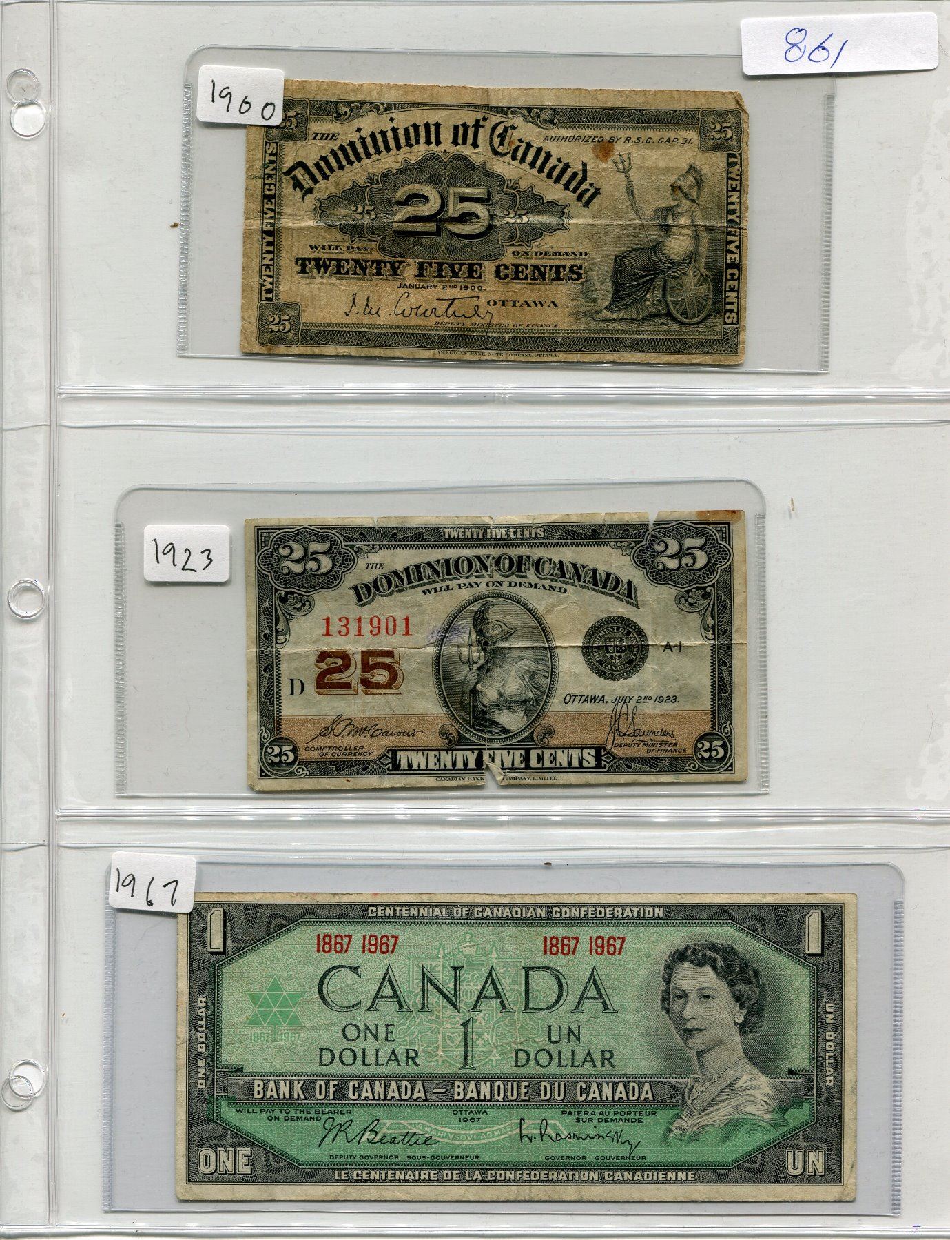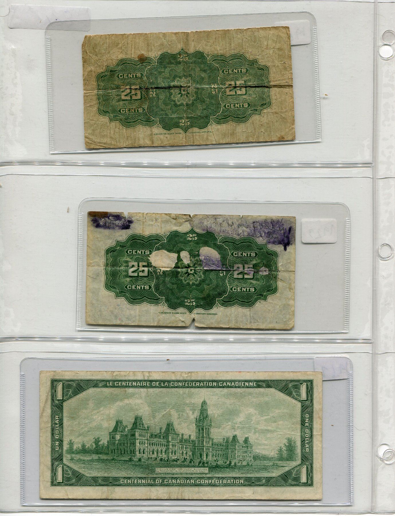 SHEET OF PAPER MONEY INCLUDING: 1900 25 CENT SHINPLASTER, 1923 25 CENT SHINPLASTER AND 167 CANADA ONE DOLLAR CENTENNIAL YEAR.