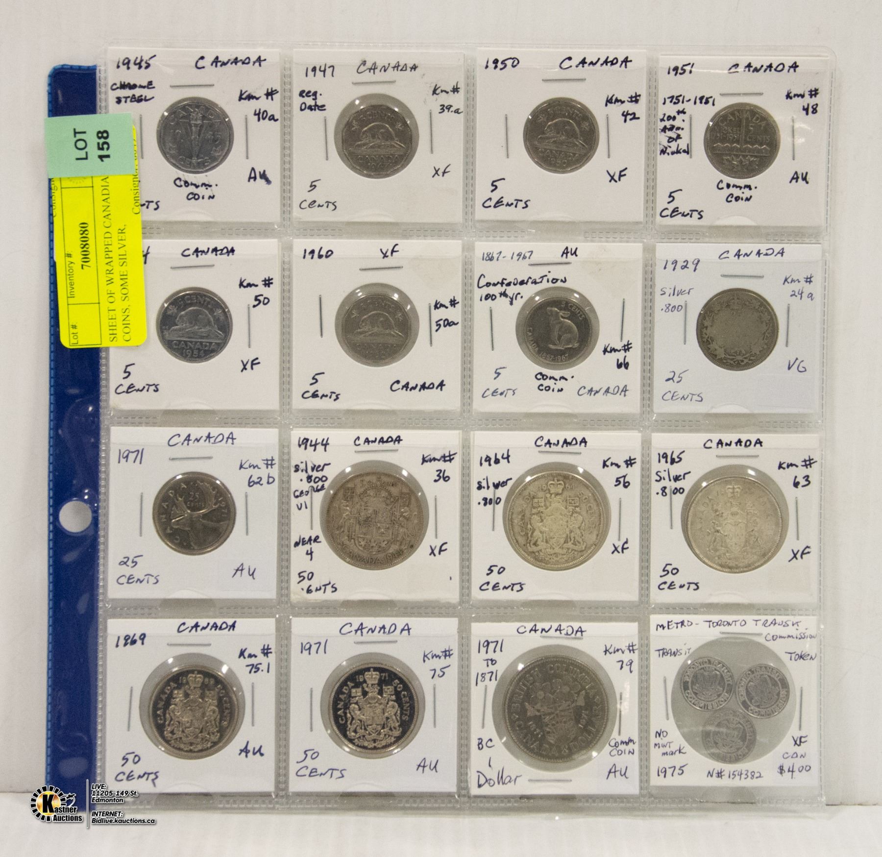 SHEET OF WRAPPED CANADIAN COINS, SOME SILVER,