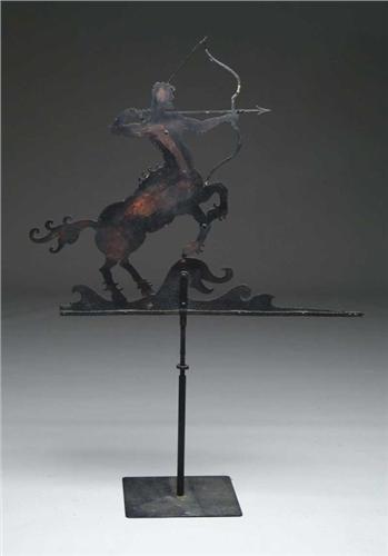 SHEET STEEL SILHOUETTE CENTAUR WEATHERVANE. Classical depiction of the half man/half horse figure shooting an arrow with nicely shaped bow. The tail and mane in nice scroll work with a wonderful cutout wave scroll type rod. SIZE: 28-1/2” h x 35-1/2” l. CONDITION: Some pitting to rod and waves. The tip of the arrow has been detached but is present. Otherwise good. 9-27529