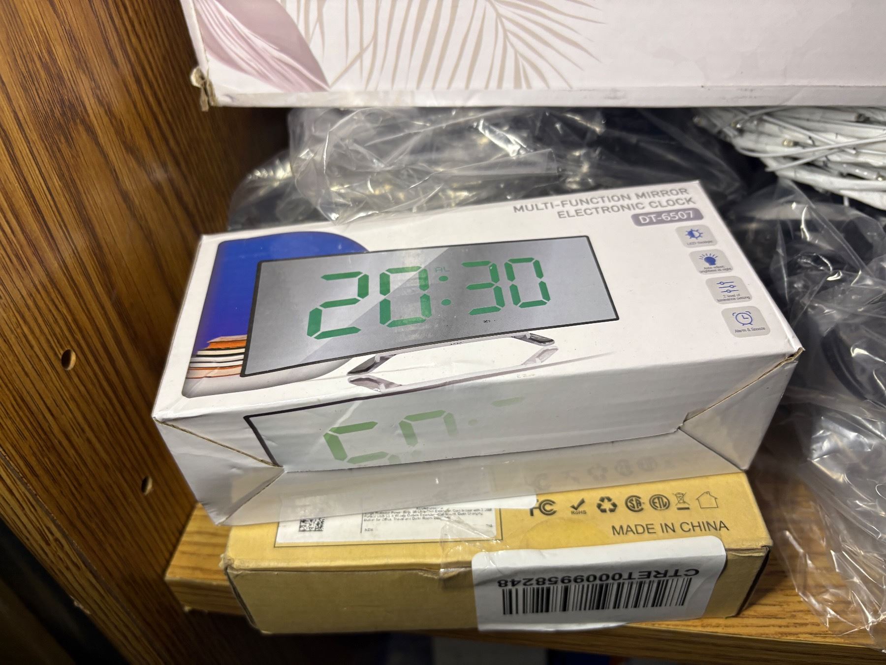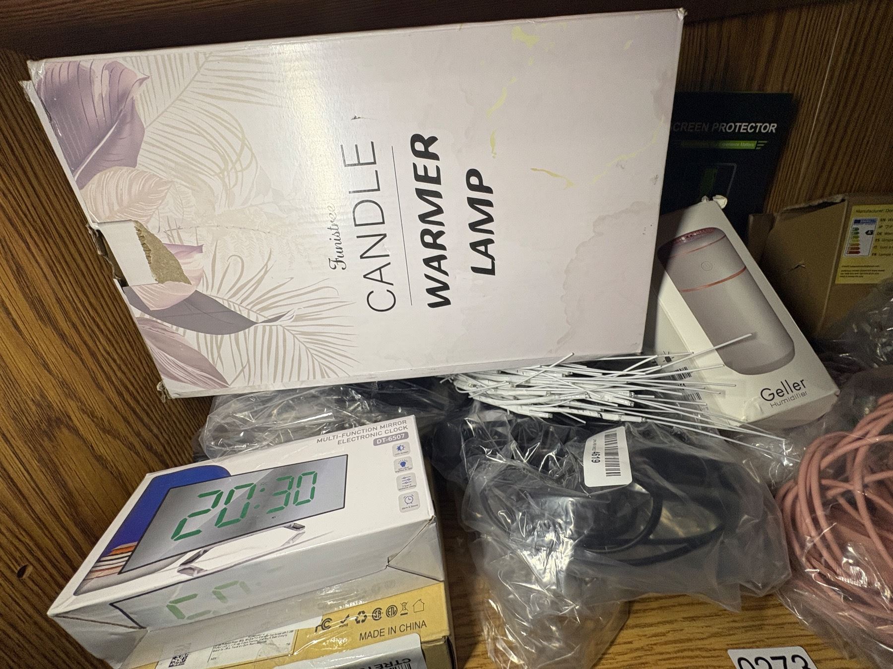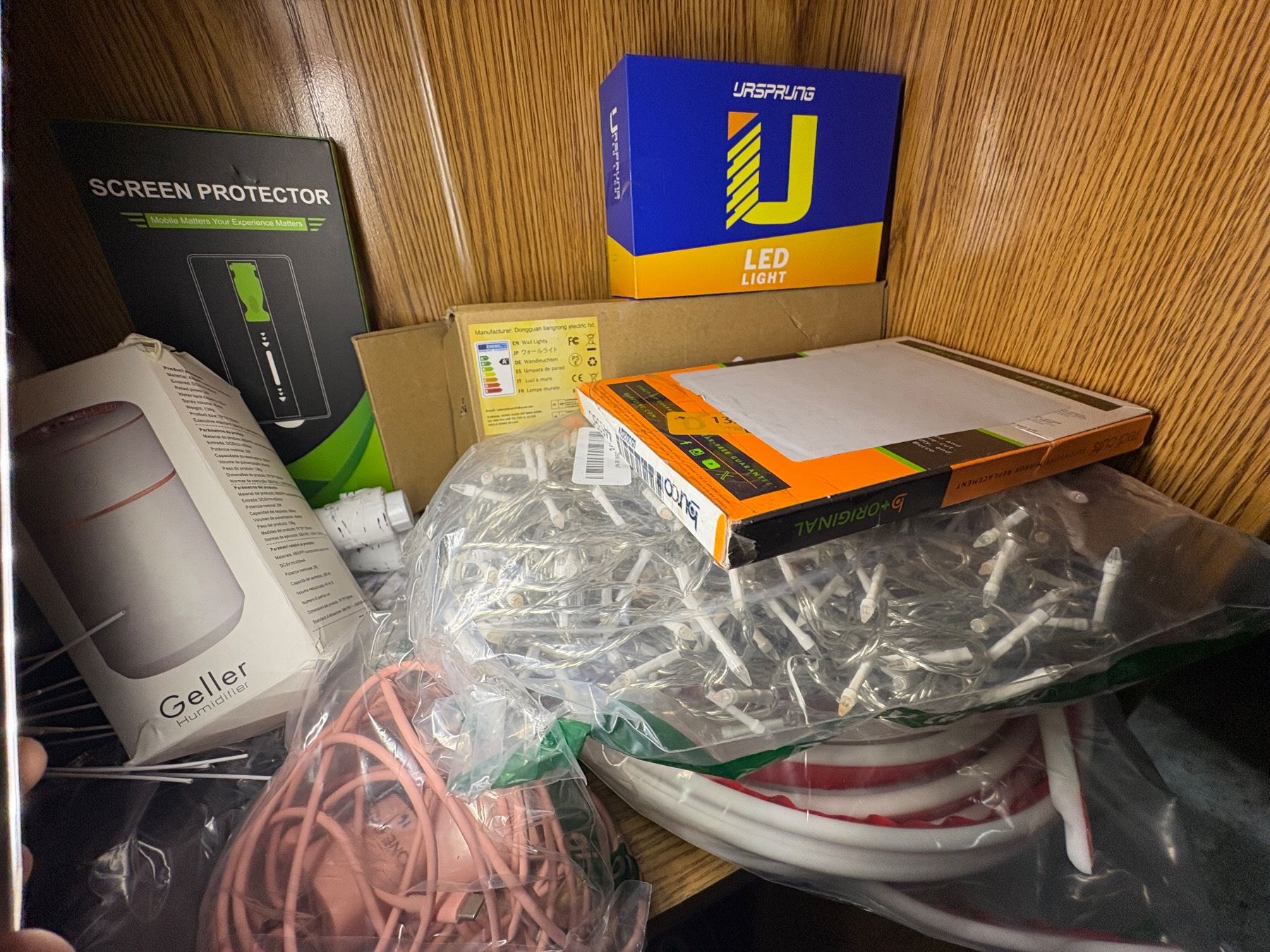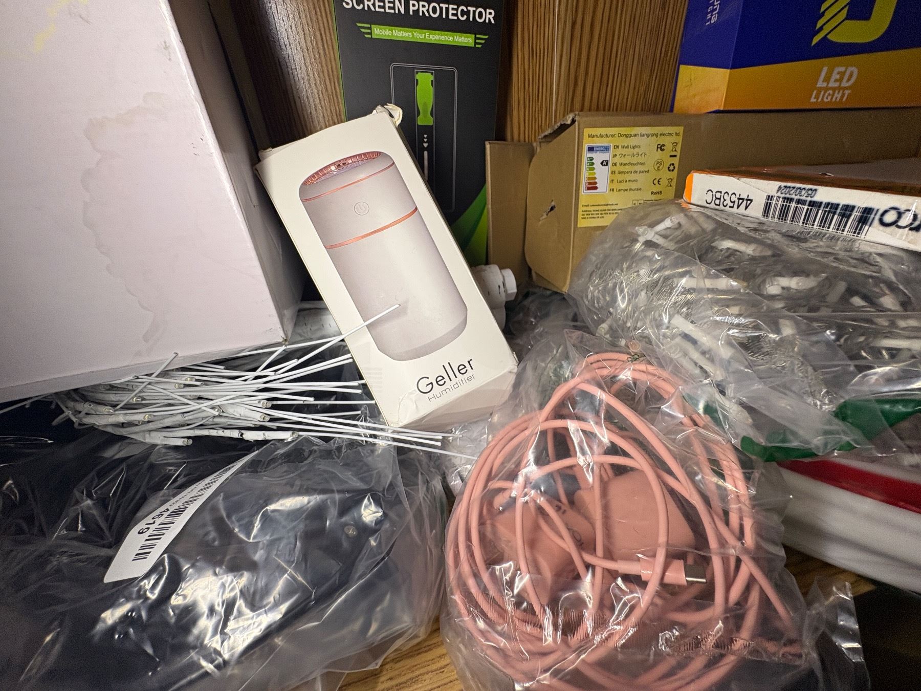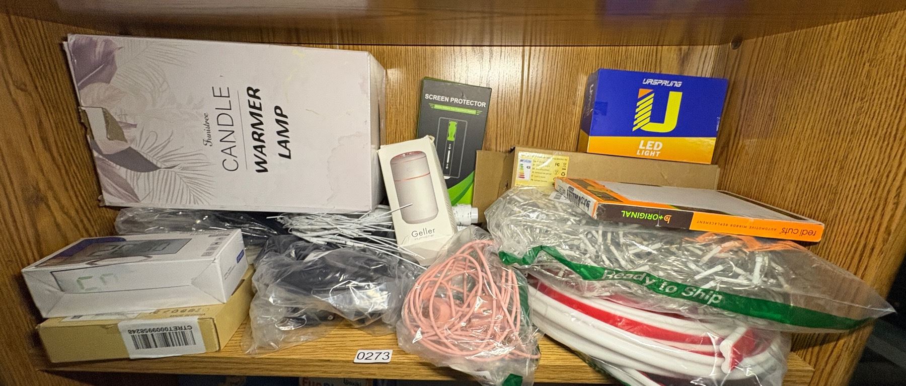 SHEF LOT FULL OF ELECTRONICS - SCREEN PROTECTOR, GALLOR, HUMIDIFIER, MULTIFUNCTION MIRROR, USBC ADAPTERS AND CABLES AND STRING LIGHTS, ETC