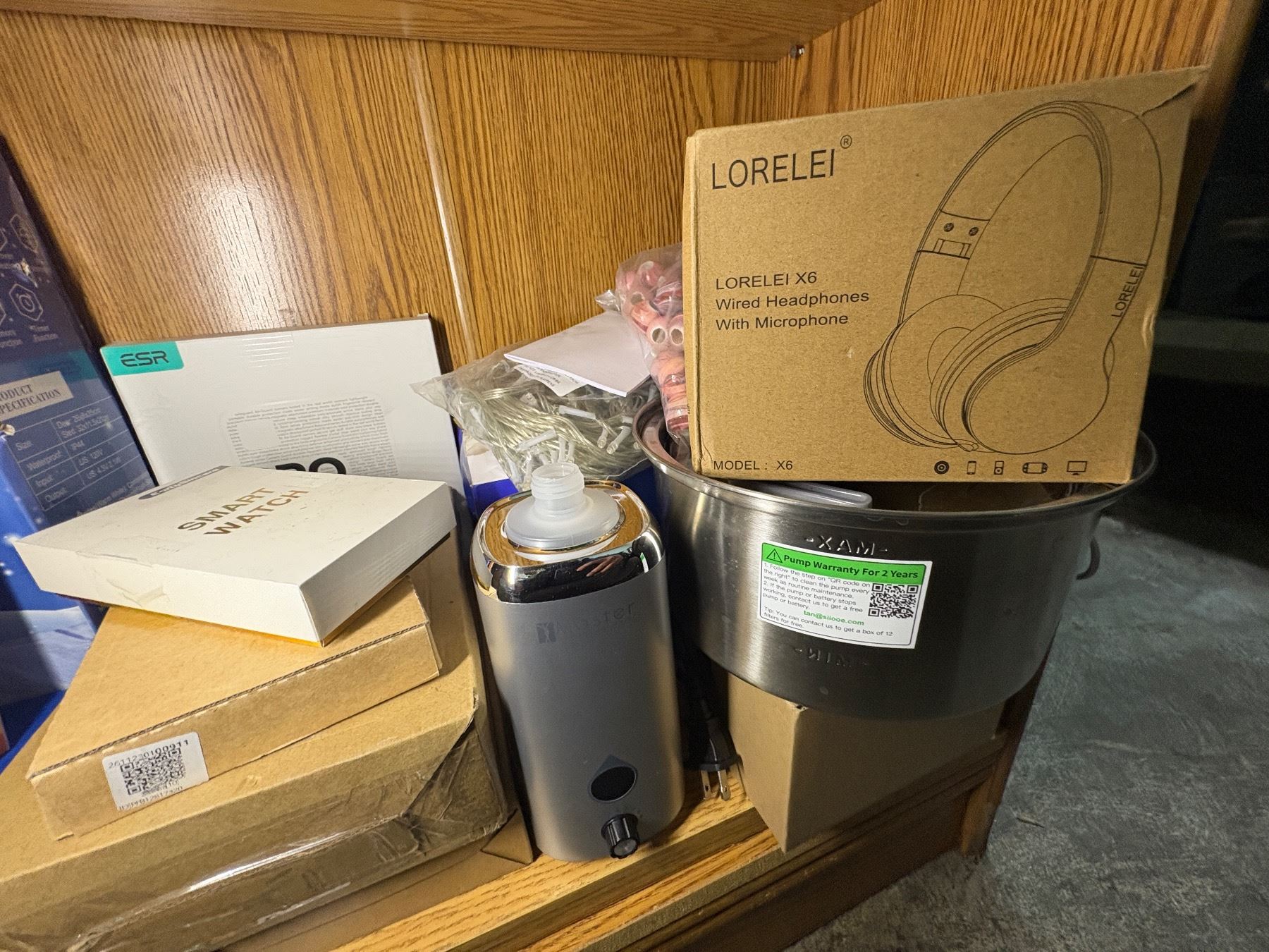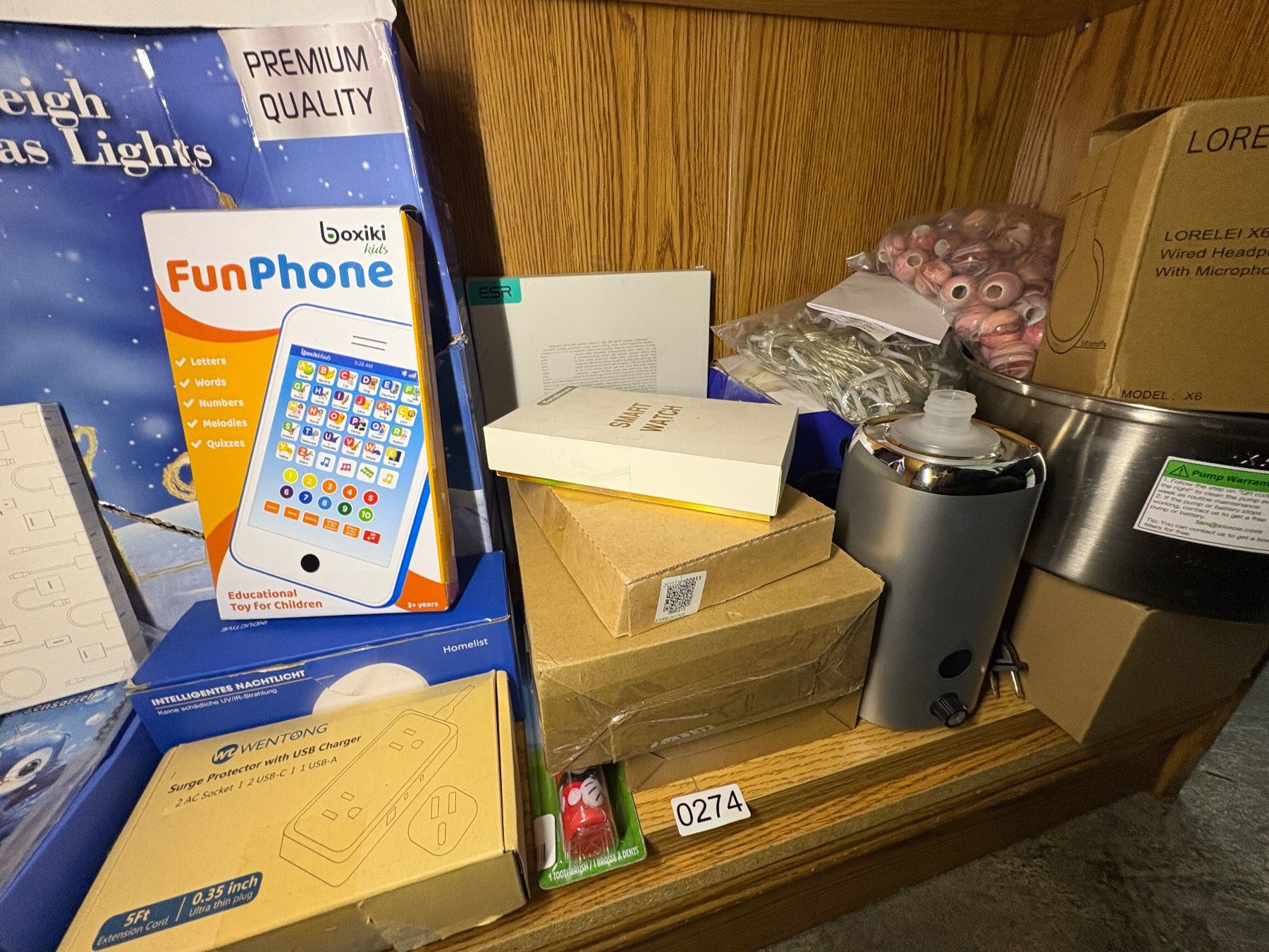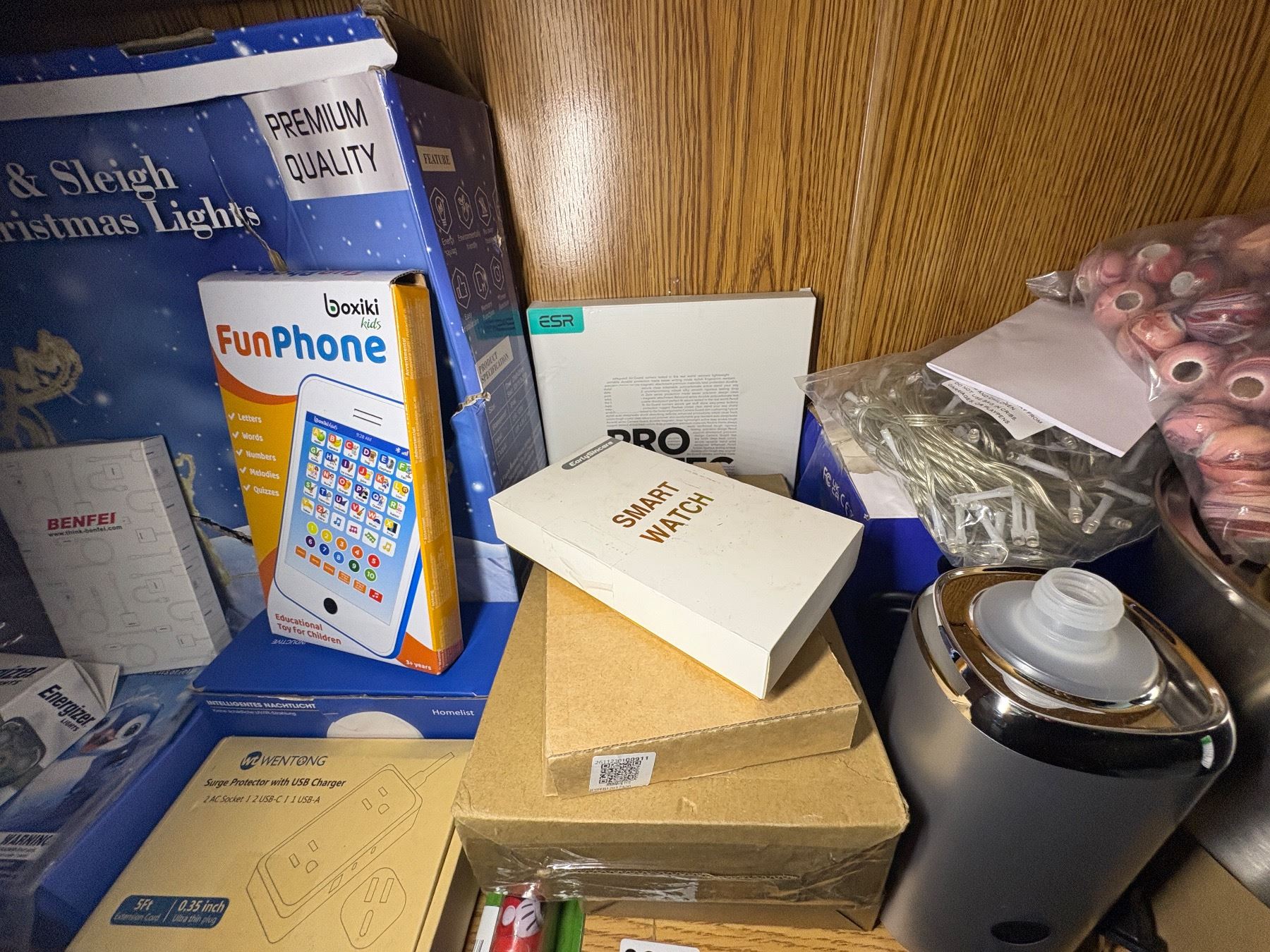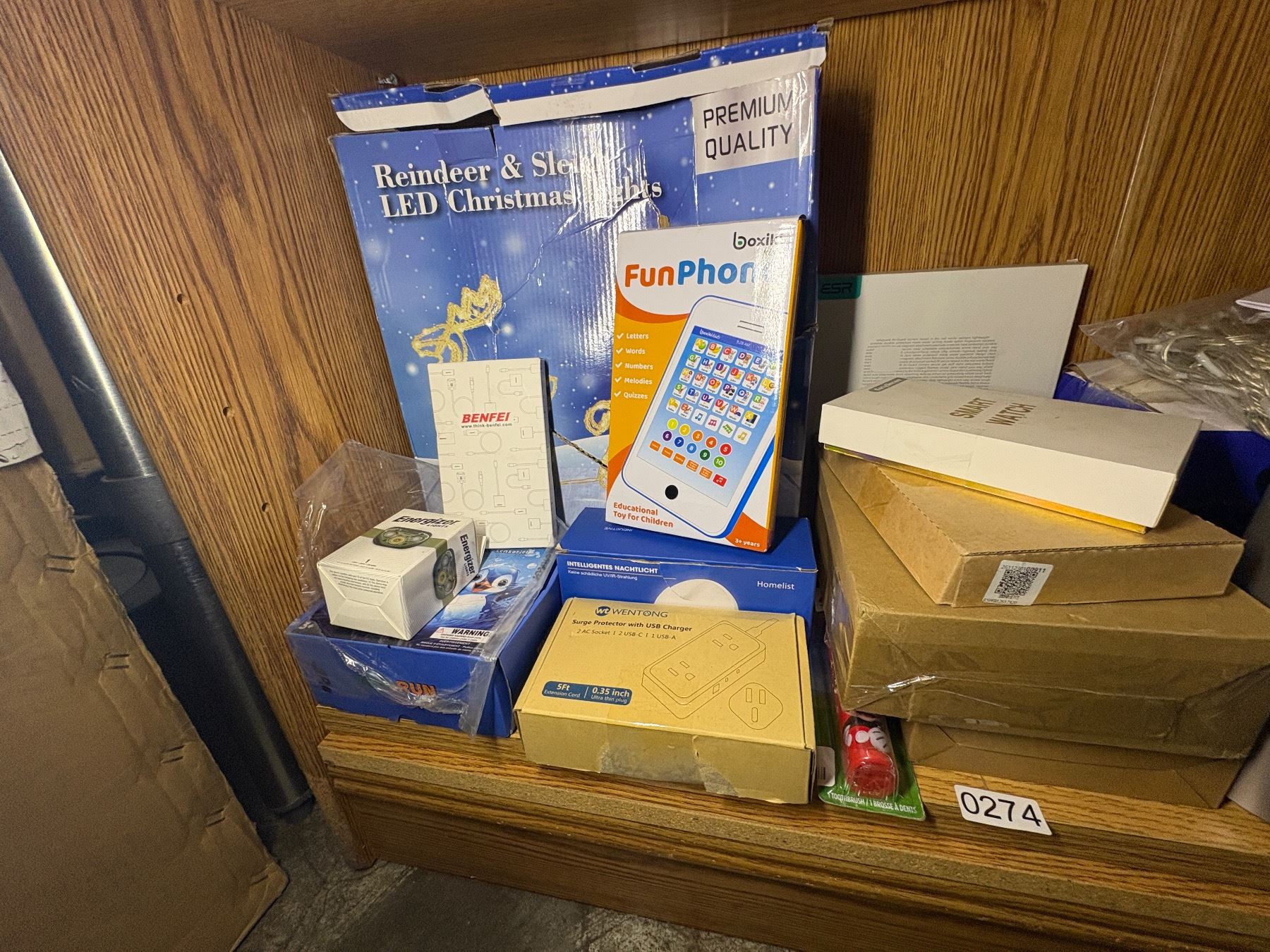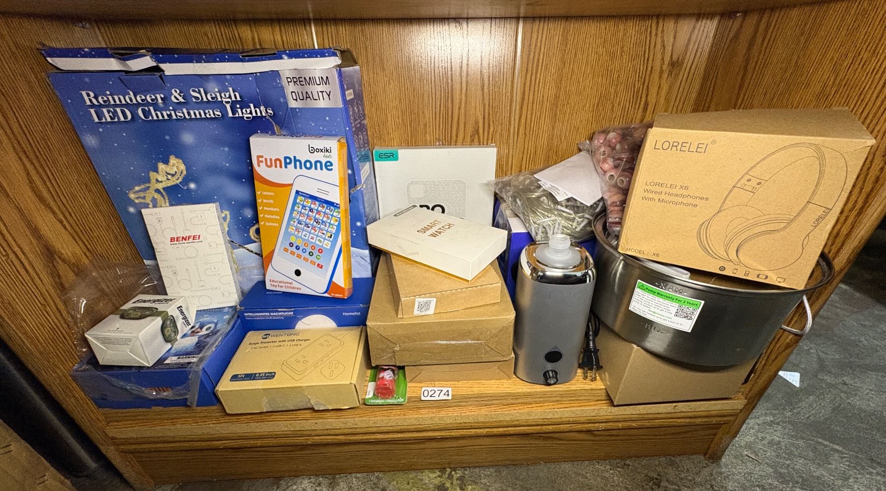 SHEF LOT OF SOATED ELECTRONICS - ENERGIZER LIGHTS, SMART WATCH, HEAD PHONES, SURGE PROTECTOR WITH USB CHARGER, LED CHRISTMAS LIGHTS, ETC.