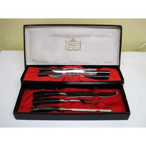 LUXURIOUS GOLD PLATED CARVING SET,MADE BY SHEFFIELD ENGLAND, IT COMES WITH LOVELY CELLULOID HANDLES AND SOME GOLD PLATING, HARDLY USED, CONSISTING OF LARGE CARVING KNIFE, FORK AND KNIFE SHARPENER,PLUS 4 KNIVES, ALL SEEMS TO BE IN MINT - EXCELLENT - WHAT IT LOOKS LIKE, NEVER USED CONDITION, ORIGINAL BOX IS ALSO IN VERY CLEAN MINT CONDITION ON INSIDE BUT ON OUTSIDE SHOWS STORAGE AGE.Buyer please remit 10.00 for shipping plus insurance.THANKS.