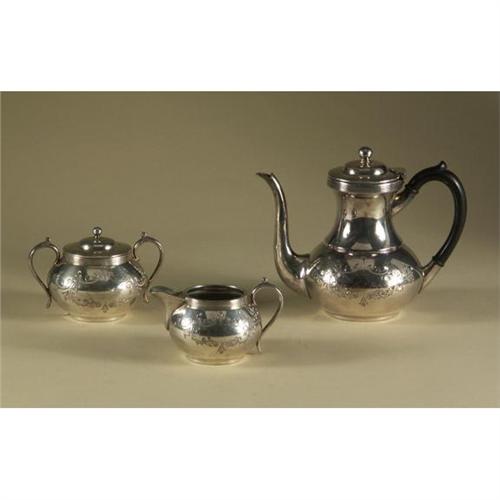 SHEFFIELD PLATE: An afternoon Sheffield Silver plated tea set consisting of teapot, double handled covered sugar, and creamer, incised and hand hammered scroll works on the sides of each piece, the lip or top of each piece is in ring form, hallmarked Cooper Brothers, later Sons, (1850 1964). The mark dates from 1867-1964 and the firm has a fine reputation as a maker of Sheffield Silver plate.