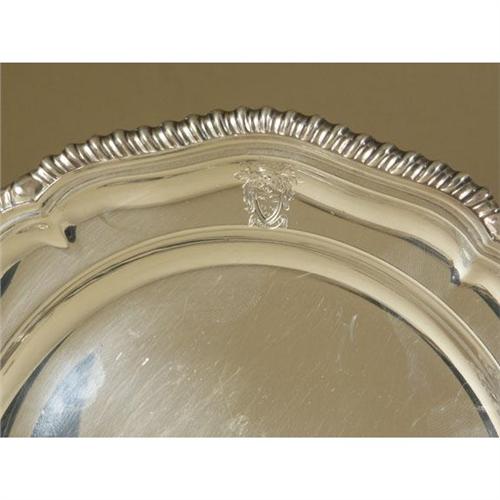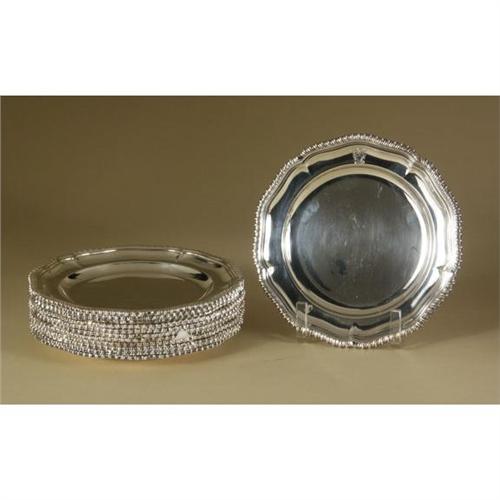 SILVER PLATE: A lot of twelve silver on copper salvers, in the style of George III, round, 7.25'', classic molded gadroon edge, each containing an unidentified coat of arms, roll and crimped edges, Sheffield, made in England, early 20th century. Note: Some minor pit marks, multiple surface rub marks from being stack without spacers over the years and scratch surface marks on both the top and bottom of some.
