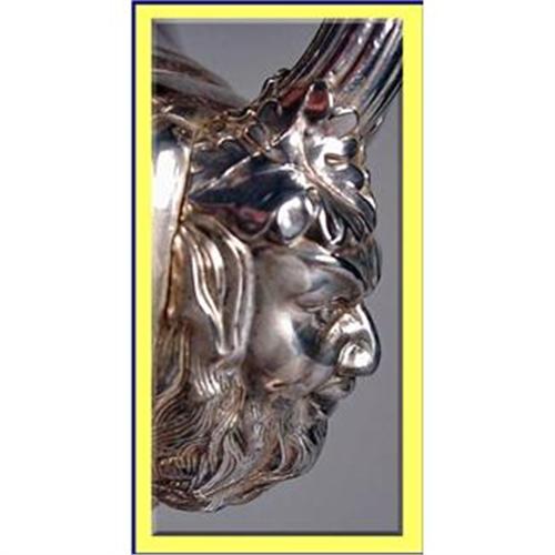 Fabulous Sheffield Plate silver wine cooler. Made in England, early 19th century. 9 1/2inches tall. Removable top. Ring in the bottom to hold wine bottle securely. Urn shape on round foot. Fluted decoration to sides, base and handle. Beaded inner rim to top. Rich repousse vineleaf and shell decoration around outer rim shows first quality workmanship. Magnificent handles, curve up gently, fluted with an overlay of foliage. Each handle is connected to the body of the wine cooler by a fantastic satyr's mask with long ears, hooked nose, foliage for hair and waving beard. Like most early Sheffield silver, there are no hallmarks. The quality of the actual silver is fabulous with a minimum of bleeding on the rim of the foot, showing the copper underneath.