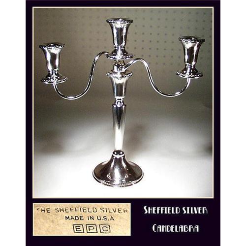 Gorgeous 3 tier silver candelabra. Top section can be removed and used as single candlestick. The base is marked : The Sheffield Silver, Made in the U.S.A. Excellent condition, 14" high and 13" wide, weight is 3 lbs and 5 ounces. If the top section is removed, the height of single candlestick is 9-1/2". If interested, please note that we have 2 candelabras available, but you are buying one piece.