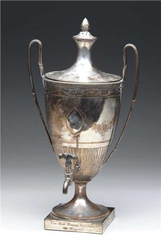 SHEFFIELD SILVER PLATED COVERED TEA URN. Federal style with long narrow handles and nut finial has tapered urn design with square base. Engraved “New York Racing Association The Tempted Aqueduct 1975 Won By Milton Somerfield’s 8 S. Cardile’s”. Wood handled spigot and a nice patina with much copper showing through. SIZE: 19-1/2” h x 10-1/2” at widest. 9-27096