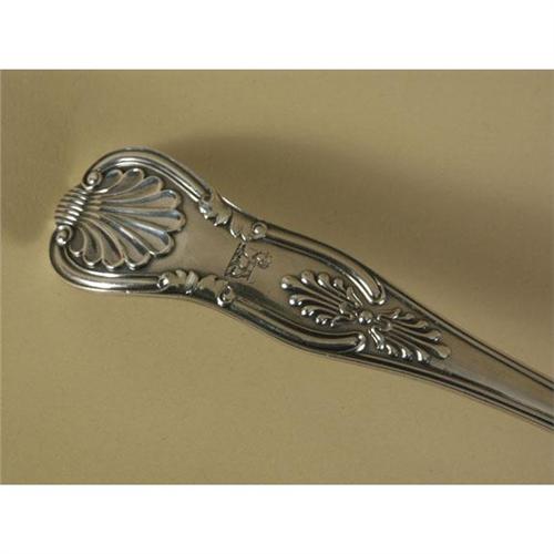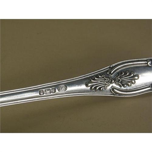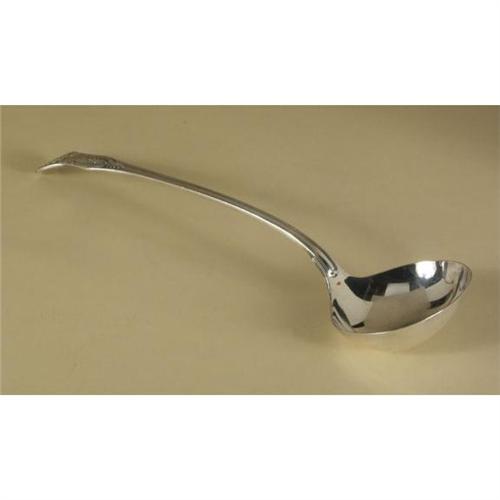 SHEFFIELD SILVER: A large bowl shaped soup or stew ladle, 13.25'', ''Kings Pattern'', hallmarked with Crown, Lion Passant and date 1895-1896, makers mark indicates the maker to be London silversmith Joseph Ridge (John Round and Sons Ltd.) late 19th century and early 20th century known for fine Sheffield Silver. Note: some fine pitting and wear on the ladle portion.