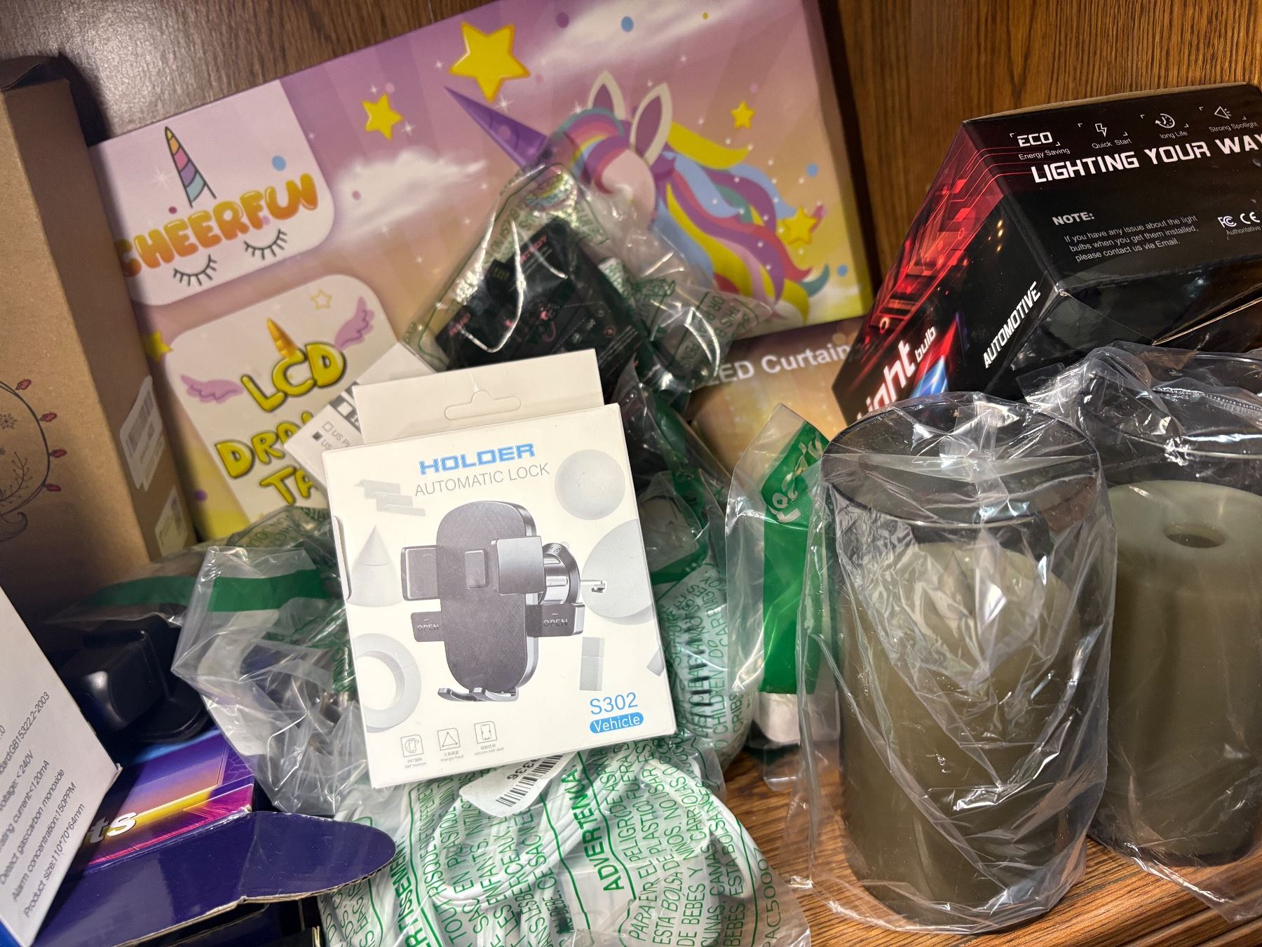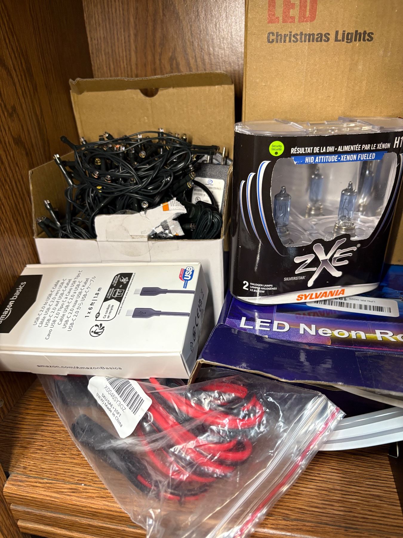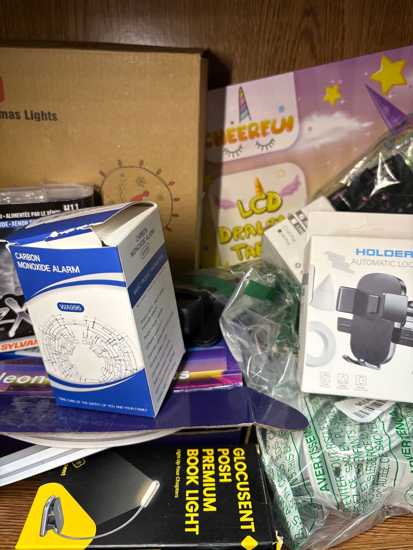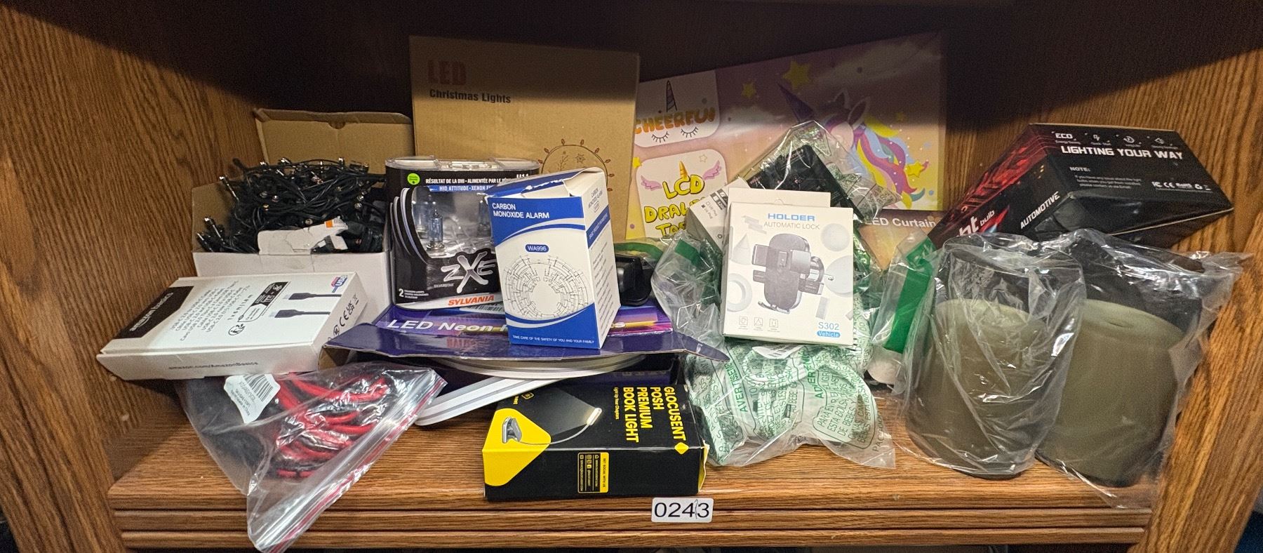 SHELF LOT FULL OF ASSORTED ELECTRONICS AND MISC. - BOOK LITE/ PHONE HOLDER/ ELECTRIC CANDLES/ STRING LIGHTS ETC