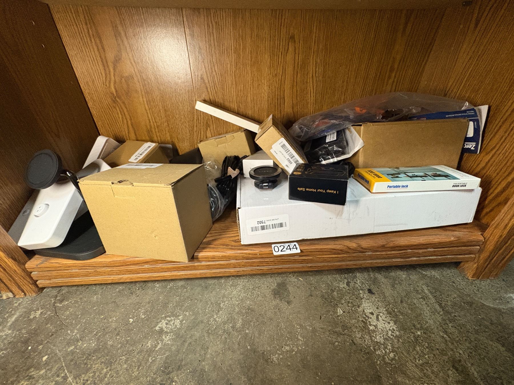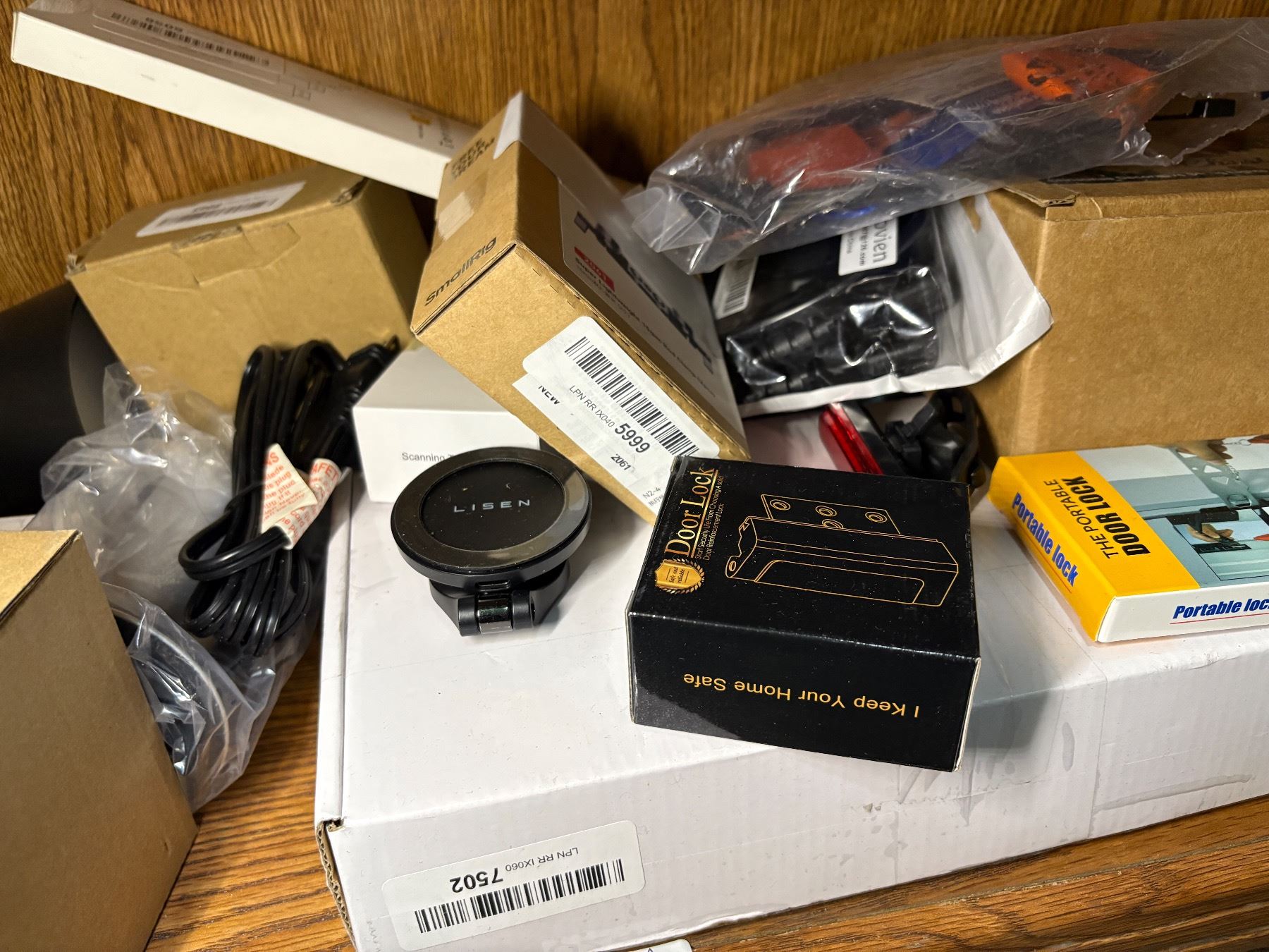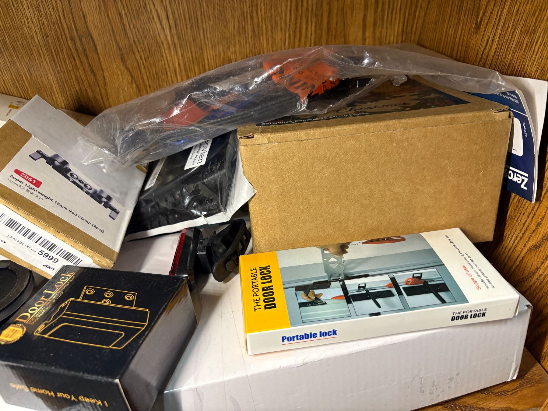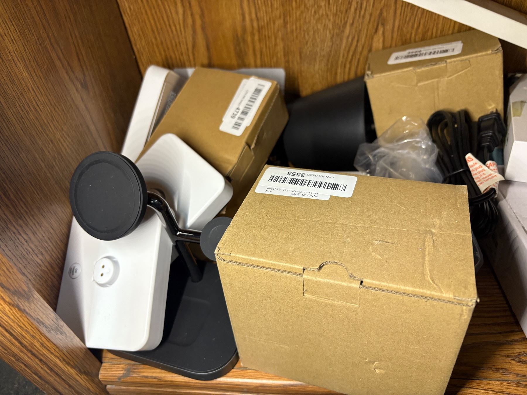 SHELF LOT FULL OF ASSORTED ELECTRONICS - MAGNETIC PHONE AND SMART WATCH HOLDER/ LIGHTS/ HARDWARE/ DYSON BATTERY, ETC
