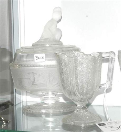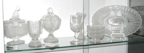 SHELF LOT OF AMERICAN PRESSED GLASS, (9) incl. Indian covered dish, 9" high, 19th century, CONDITION: excellent, minor chips. PACKING AND SHIPPING BY FAIRFIELD AUCTION WITHIN CONTINENTAL USA (excluding insurance) $40