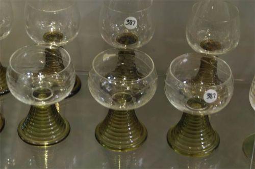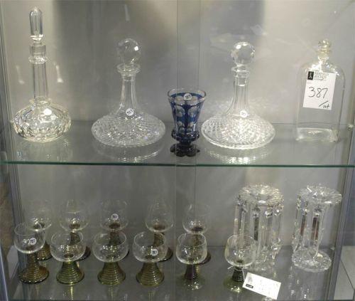 SHELF LOT OF GLASSWARE, including 4 decanters and a group of etched glass stemware, condition: generally very good, PACKING AND SHIPPING (excluding insurance) $50,