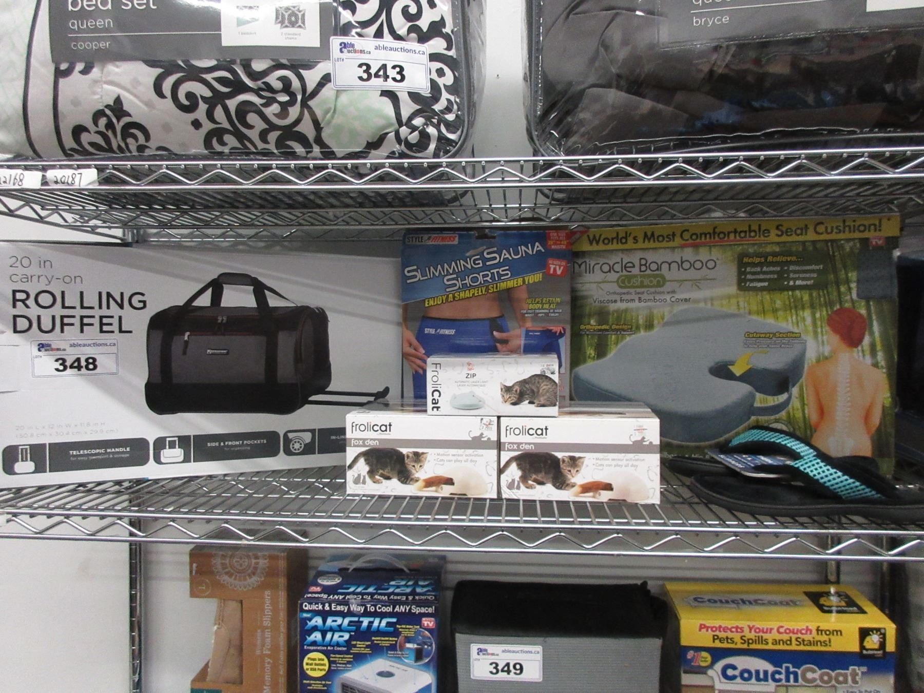 SHELF LOT OF MIRACLE BAMBOO PILLOW, CAT TOYS, ROLLING DUFFEL BAG, SAUNA SHORTS, SLIPPERS