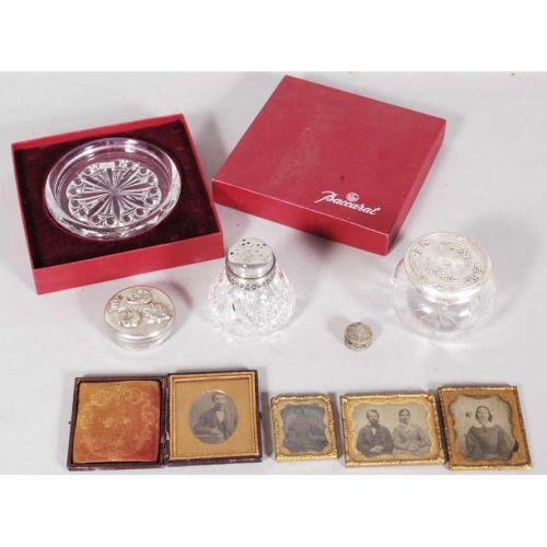 1 SHELF LOT: tin types, silver capped jars, Baccarat