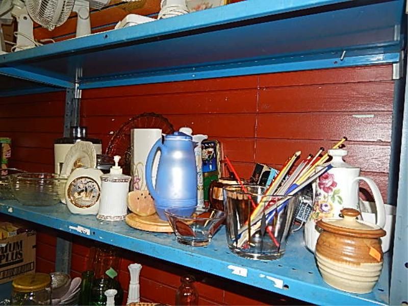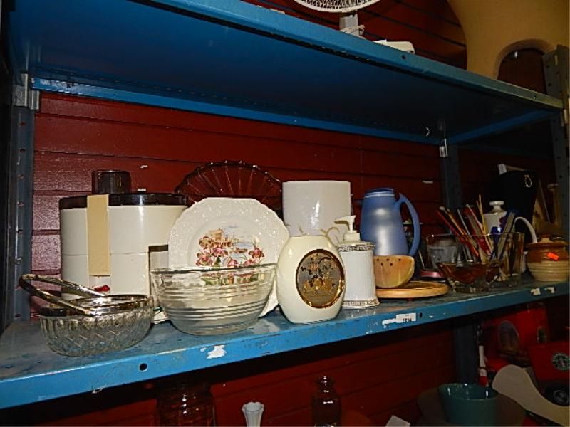 SHELF OF BOWLS, FOOD PROCESSOR, TEA POT & MORE