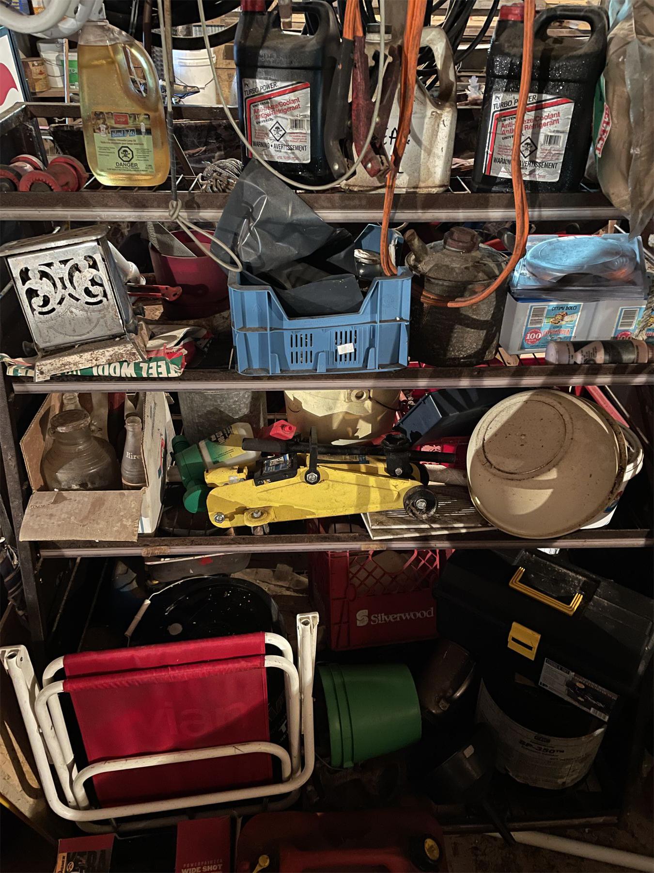 SHELF W/ CONTENTS - ANTI-FREEZE, FLOOR JACK, TOOL BOX, HYD OIL, ETC