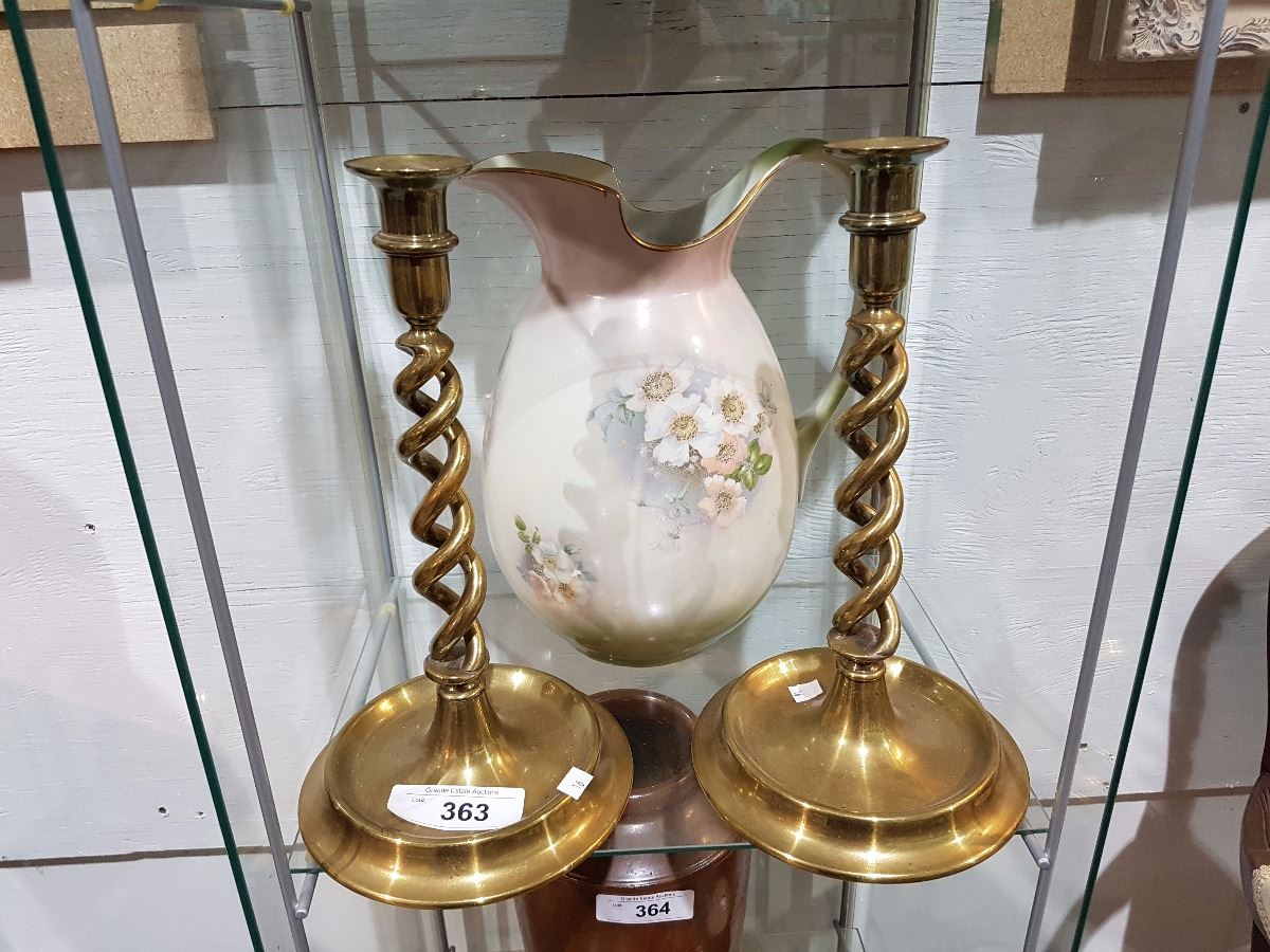 SHELF W/LARGE PITCHER & BRASS CANDLSTICKS