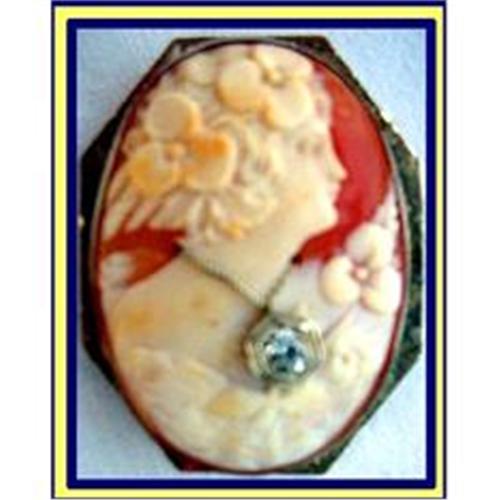 Outstanding carving - cameo set in 14karat gold brooch with a .25point diamond set in the middle. Has a loop so that can be worn as a pendant and a pin so that can be worn as brooch. 2 inches long and 1 1/2inches accross. Outstanding carving depicts a young lady in profile. Neo Classic style reminiscent of the Old Romans. Very deep carving and warm tones of the natural shell. A silver chain around the ladie's neck with a diamond pendant, measuring .25point. Fabulous detail to flowers, hair, face and dress. Gold setting with chased scrolls to add texture and play of light. Excellent condition - no damage of any sort. Marked 14K on the pin. see also fabulous cameo in bronze frame from same home.