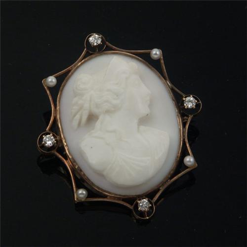 CAMEO: Dainty shell cameo framed by 14K red gold set with seed pearls and round cut diamonds. Appraisal included.