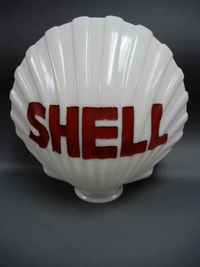 SHELL CLAMSHELL MILKGLASS GAS PUMP GLOBE 18 1/2" X 11 1/2" X 17 1/2" LOCATION: LOWER LEFT