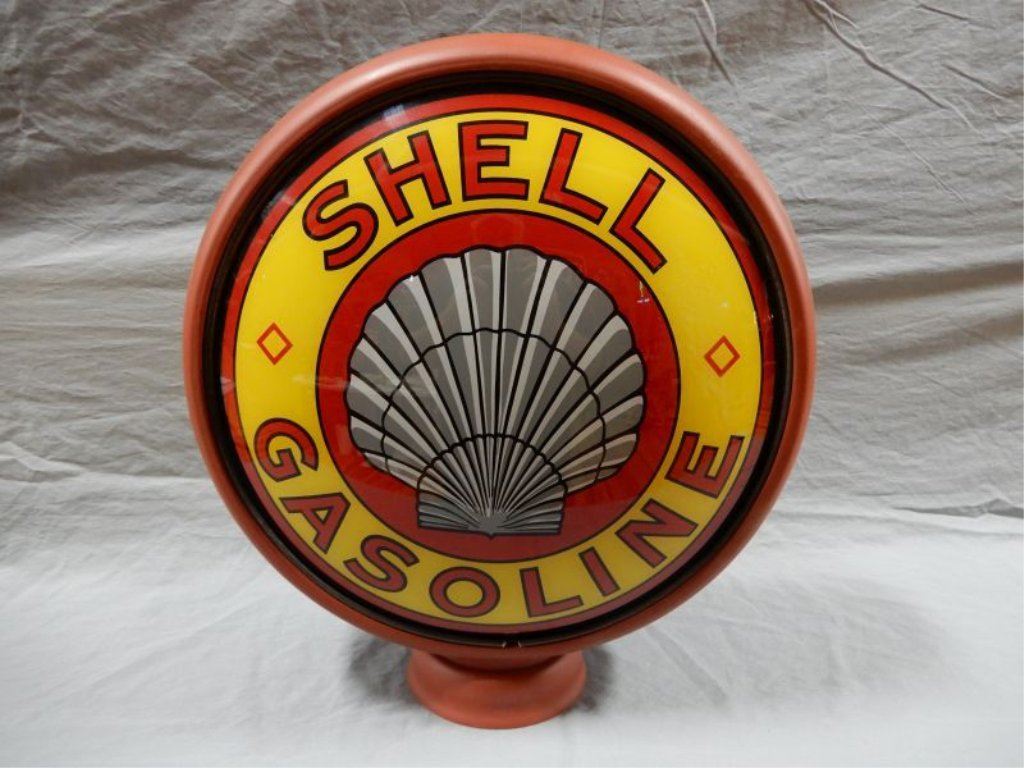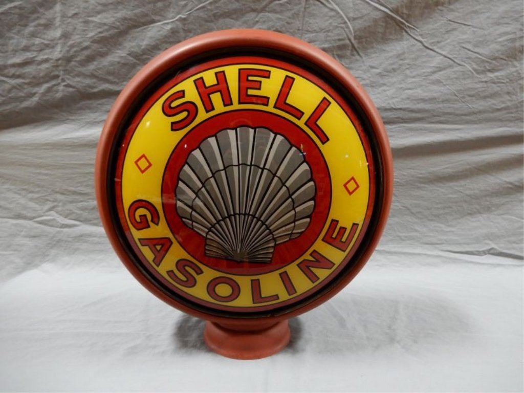 SHELL GASOLINE PUMP GLOBE METAL BODY WITH METAL RING ORIGINAL 15 1/2" GLASS LENSES OLDER REPRO LOCATION: UPPER RIGHT