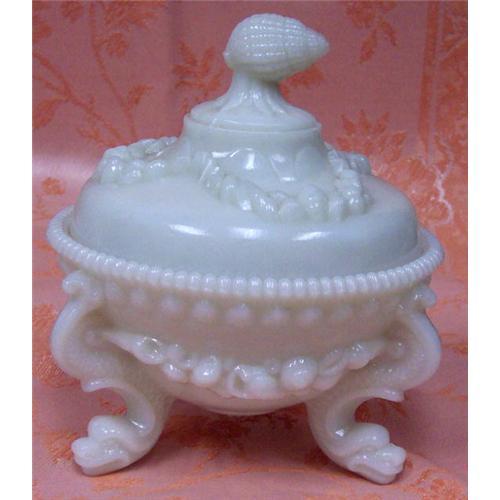 THIS IS A NEAT OLD SHELL PATTERN MILK GLASS CANDY DISH. THE BOTTOM OF THE DISH HAS THREE GARGOILS FOR FEET. THIS IS AN EARLY ONE I CAN TELL BY THE COLOR OF THE MILK GLASS.YOU MILK GLASS COLLECTOR'S CHECK THIS OUT!!!