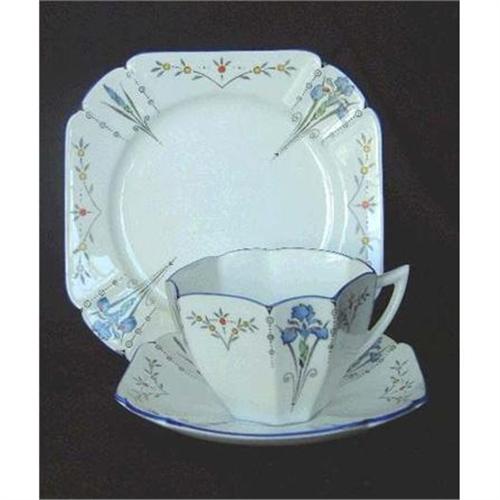 Queen Anne shaped porcelain cup , saucer and plate by Shelley decorated with the Blue Iris pattern , pattern number 11561. In good condition without damage or repair. No crazing but small amount of wear to the painted decoration. SIZE 9.5 ins x 8 ins.