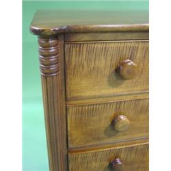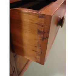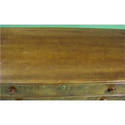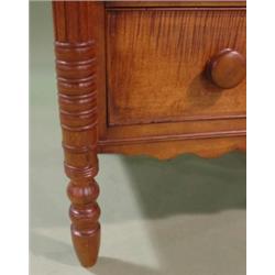 SHERATON CHERRY & TIGER MAPLE 4 DRAWER CHEST. Cookie corners and column legs in front. Tiger maple drawer fronts. 4 dovetailed drawers. Shaped apron bottom. 37" H, 42.25" W, 20.5" D