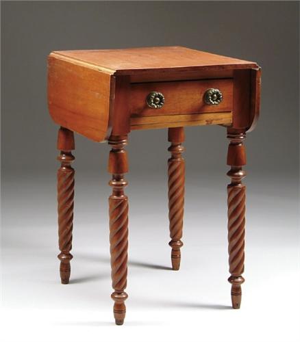 SHERATON BIRCH DROP LEAF ONE-DRAWER SEWING STAND. Early New England Birch one-drawer stand with rounded drop-leaf sides and single fitted & dovetailed drawer. Rope-carved legs and having a pull out sewing bag frame beneath the fitted drawer. The sewing bag fabric long since missing. SIZE: 28in. h; (top, when closed) 19-1/2in. x 17-1/2in.. CONDITION: Refinished long ago. Structurally sound. 9-26412