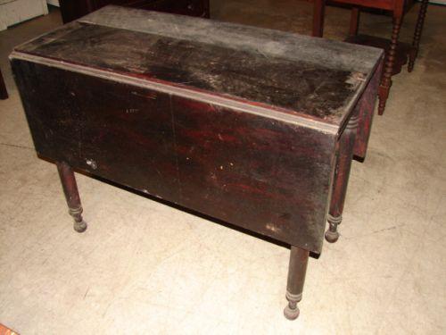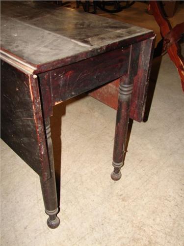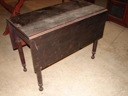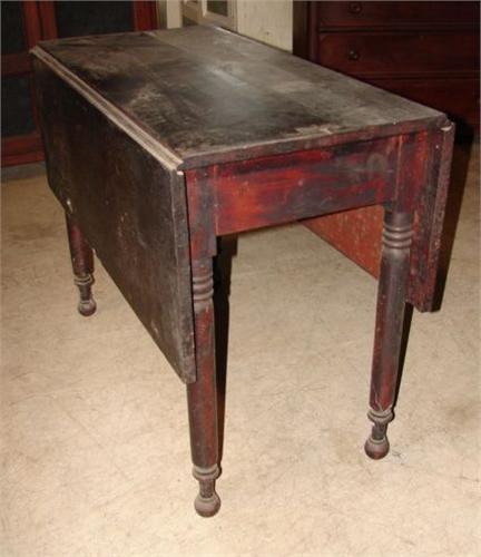 SHERATON DROP-LEAF TABLE. Early black varnish finish. Turned legs with ball feet. 29” H, 39” L, 18.5” W. Each leaf: 14” W