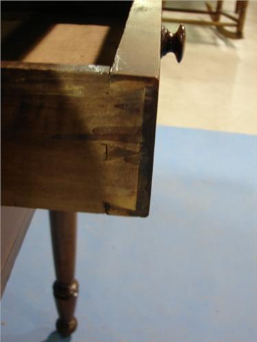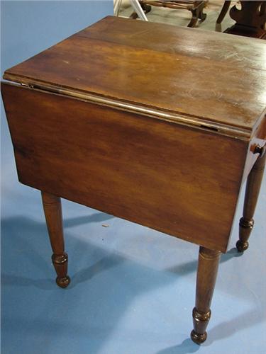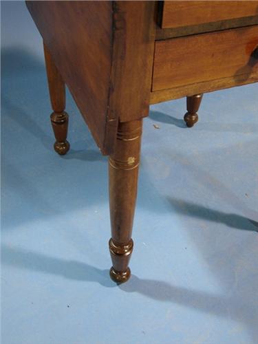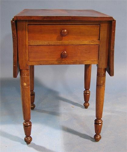 SHERATON CHERRY DROP-LEAF WORK TABLE. Two dovetailed drawers. Turned legs. Shows surface scratching at top. 29” H, 19.5” W, 22.75” D. Each leaf: 11.25” W