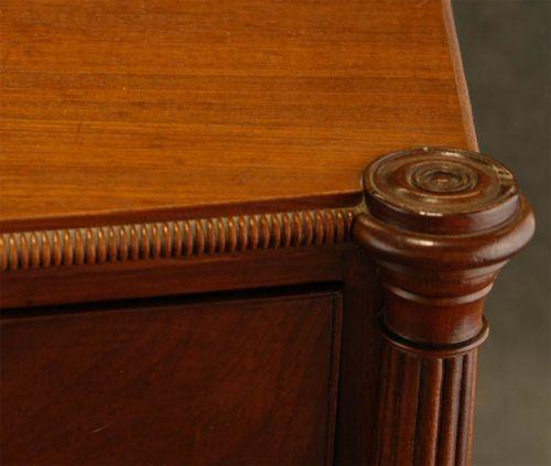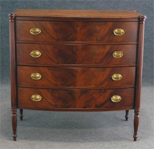 SHERATON MAHOGANY BOW FRONT CHEST with fluted columns and spool carved edge molding circa 1820