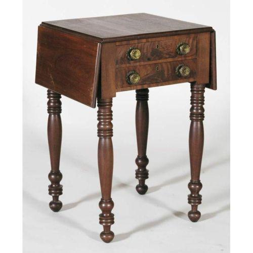 1 SHERATON MAHOGANY SEWING STAND circa 1820 CONDITION REPORT: veneer loose on back, stains to top. PACKING AND SHIPPING - see recommended shippers.