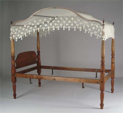 SHERATON MAPLE TALL POST CANOPY BED. Nicely turned and fluted posts with arch curved canopy. Complete with fish net hangings. Circa 1800. SIZE: Posts are 67” h. Rails are 79-1/2” l x 50” w. 53-1/2” to outside of rails; 48” to inside of rails. CONDITION: Very good. Lengthening to side rails. 9-26644