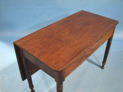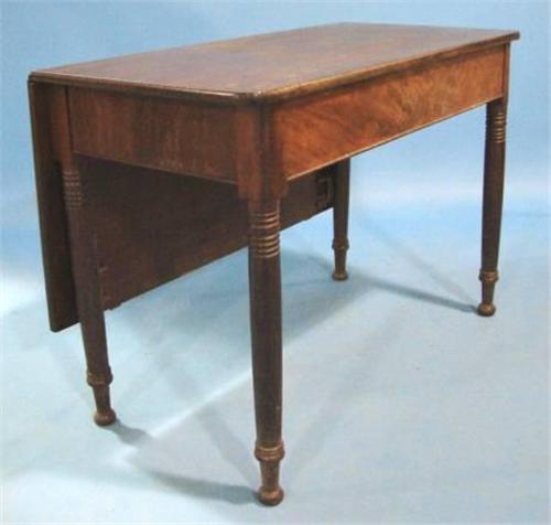 SHERATON WALNUT TABLE WITH DROP LEAF. Table is a section of a banquet table. Turned legs. Has single drop leaf. Section of wood at top has been repaired. 29" H, 20.25" L, 41" W. Leaf: 20" L