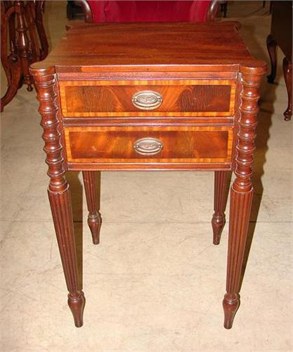 NEW ENGLAND SHERATON STYLE MAHOGANY WORK TABLE. Has two dovetailed drawers with cookie corner top. Has inlaid decoration around drawers. 27.5” H, 17.5” W, 16” D