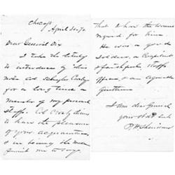 (1831 - 1888) Union major general of cavalry and famous Indian fighter. Sheridan's fighting prowess was evident throughout the war, from Booneville to Chickamauga and the elimination of J.E.B. Stuart at Yellow Tavern. A.L.S. 2pp. 8vo., Chicago, Apr. 30, 1872, to Gen. John A. Dix introducing Col. Schuyler Crosby: "…for a long time a member of my personal staff…he was a good soldier, a competent & faithful staff officer, & an agreeable gentleman…". Very good.