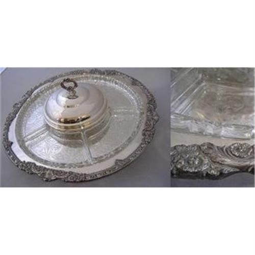 WHAT AN IMPRESSIVE AND ELEGANT SERVING PIECE. IT'S HUGE MEASURING 18" x 18" AND 3" HIGH. THE GORGEOUS SHERIDAN PLATTER IS ADORNED BY FIVE CRYSTAL INDIVIDUAL DISHES AND ONE CUT CRYSTAL CENTER BOWL WITH SILVER PLATE AND FINALE COVER. ALL TYPES OF SPREAD COULD BE ENJOYED; HOT OR COLD. THESE ARE HARD TO FIND SO DON'T MISS OUT!