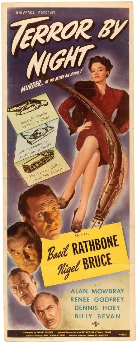 14x36" insert poster for the original release of the 1945 Universal Pictures Sherlock Holmes film starring Basil Rathbone as Sherlock and Nigel Bruce as Doctor Watson. Poster features portraits of Rathbone and Bruce at lower left watching speeding train (upon which majority of film takes place) w/full body image of Renee Godfrey at upper right. Three inset panels show illustrated clues. Poster has three horizontal folds as issued w/moderate margin wear including seven tears w/tape repairs on back, measuring between .75" and 3.5". Scattered handling/margin/corner tip wear. VG/Fine.