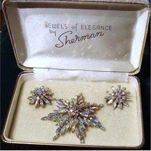 GORGEOUS 3 PC SET,MADE BY SHERMAN - EACH PIECE SIGNED,HAND MOUNTED WITH PRONG SETTINGS AND MADE FROM VARIOUS FACETED 3 ROWS STONES,ALL PIECES SIGNED "SHERMAN", AND IN EXCELLENT CONDITION, IT IS FINISHED IN "AURORA BOREALIS" FINISH, IT COMES IN ORIGINAL BOX - as per pictures, BROOCH MEASURES ABOUT CLOSE TO 2 1/2" in diam., AND EACH EARRING 1"in diam.,THE SET IS IN MINT - EXCELLENT CONDITION SO IT IS THE BOX, NICE AND CLEAN, US BUYER TO PAY 7.00 FOR SHIPPING PLUS INSURANCE,THANKS.